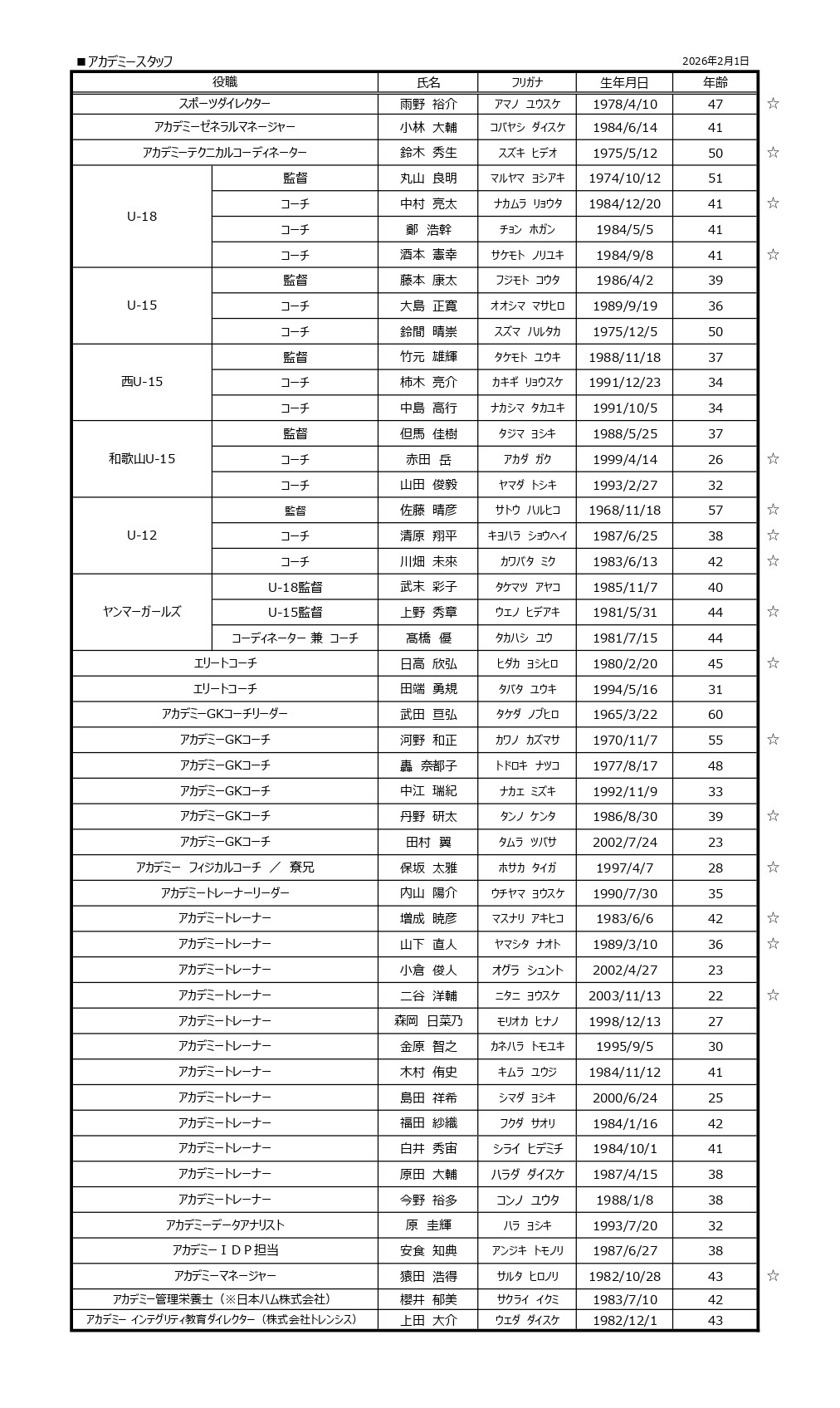 2026/02/01U-18U-15西U-15和歌山U-15U-12ガールズU-18ガールズU-152026シーズン セレッソ大阪アカデミー新体制について2026年のセレッソ大阪アカデミー新体制、およびアカデミースタッフが決定しましたので、お知らせいたします。拡大版はこちらスタッフ一覧ページはこちらこの記事をシェアする前の記事へニュース一覧へ戻る次の記事へRELATED NEWS関連ニュース2026/01/29U-18U-15西U-15和歌山U-15U-12ガールズU-18ガールズU-15ハナサカブログ育成事業 移管のお知らせ2026/01/28U-18U-18 スケジュール(2月1日-15日)2026/01/07U-18ハナサカブログU-18 スケジュール(1月1日-31日)2025/12/06U-18U-15西U-15和歌山U-15U-12ガールズU-18ガールズU-15雨野 裕介氏 スポーツダイレクター就任について2025/12/05U-18岡崎葵選手 U-16 Jリーグ選抜トレーニングキャンプメンバーに選出