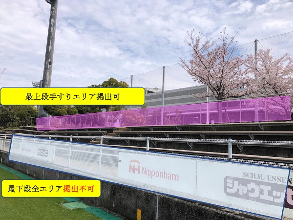 観戦エリア側の最上段手すりエリアのみ横断幕掲出可となります。