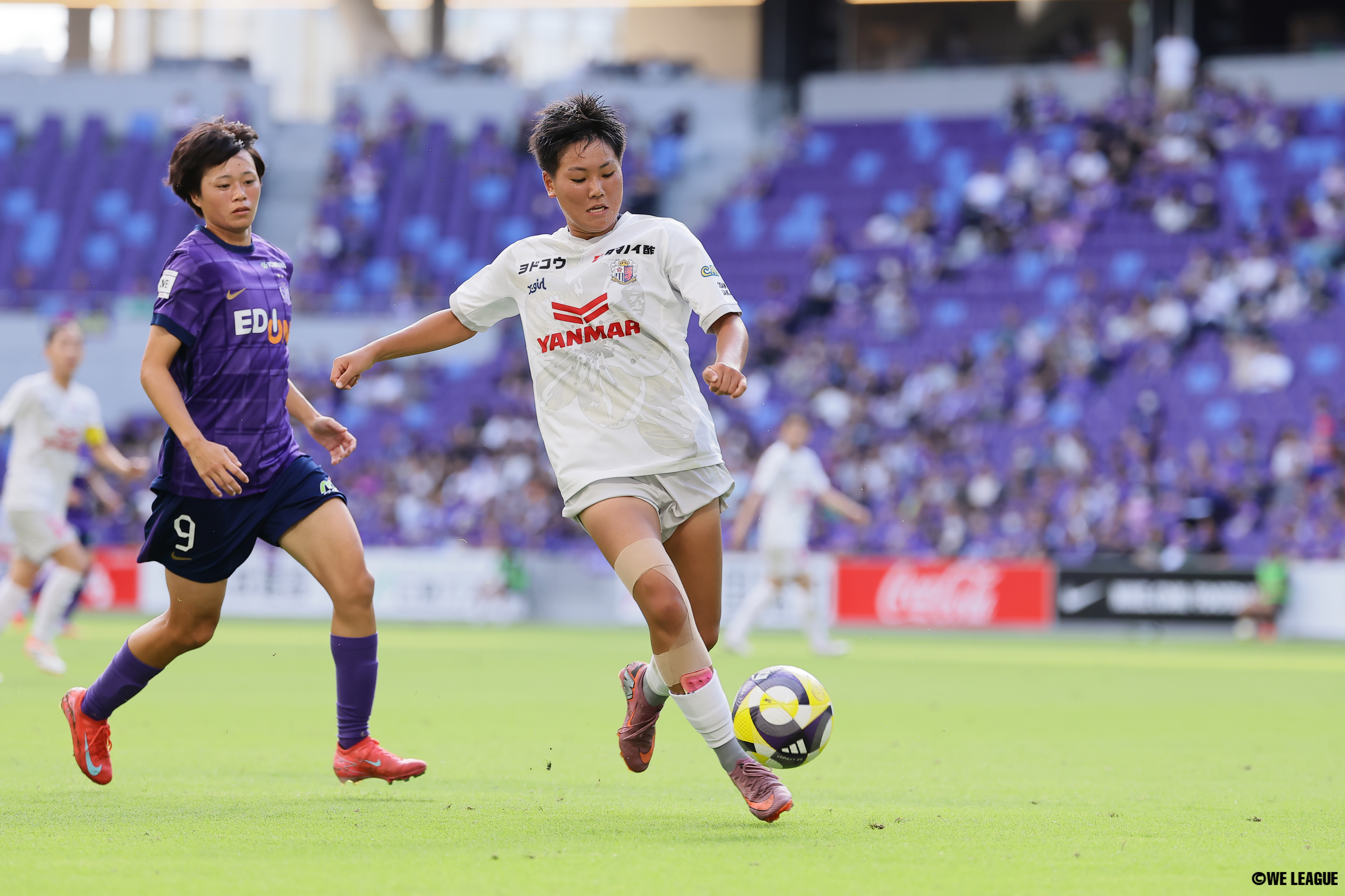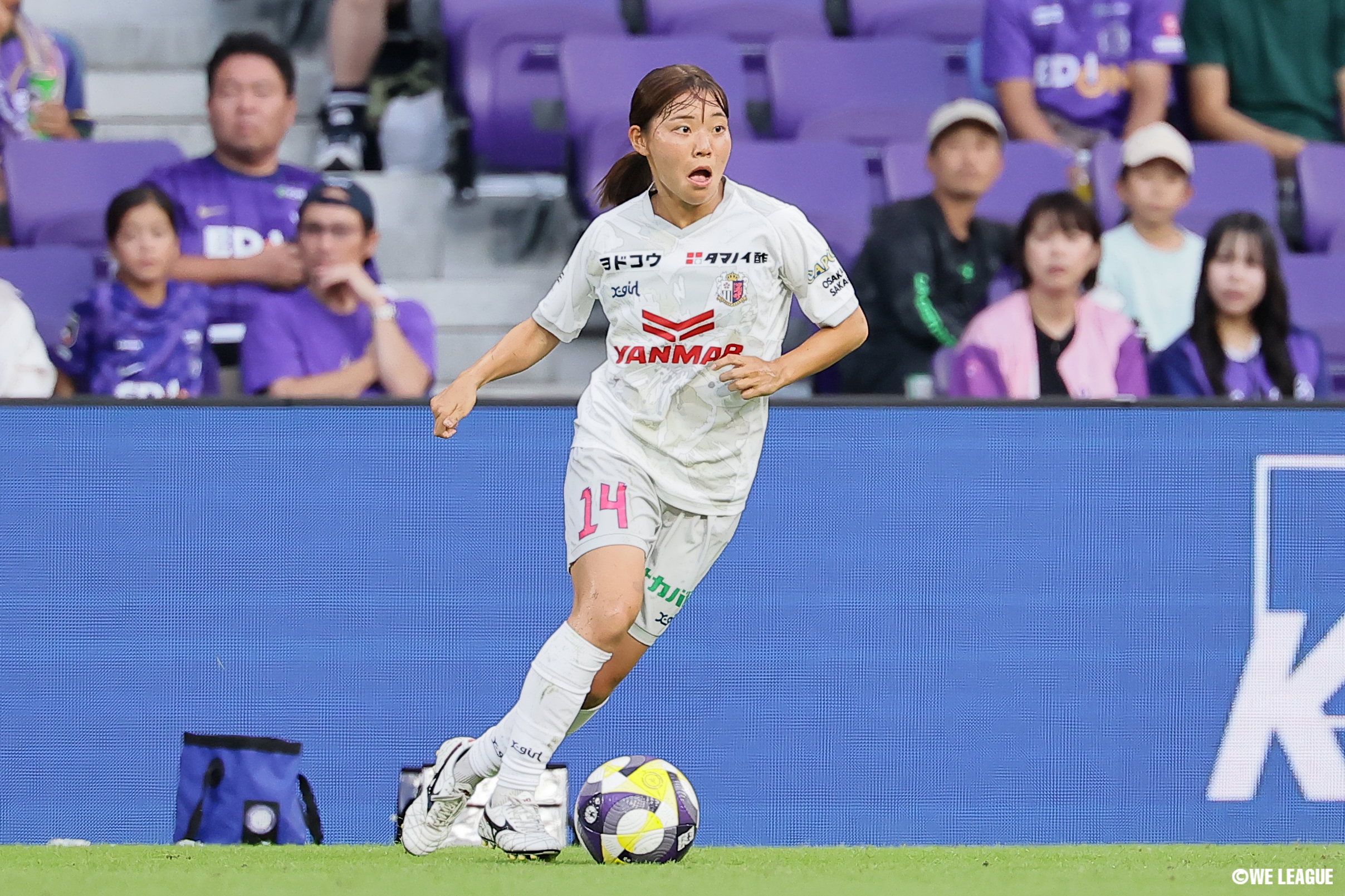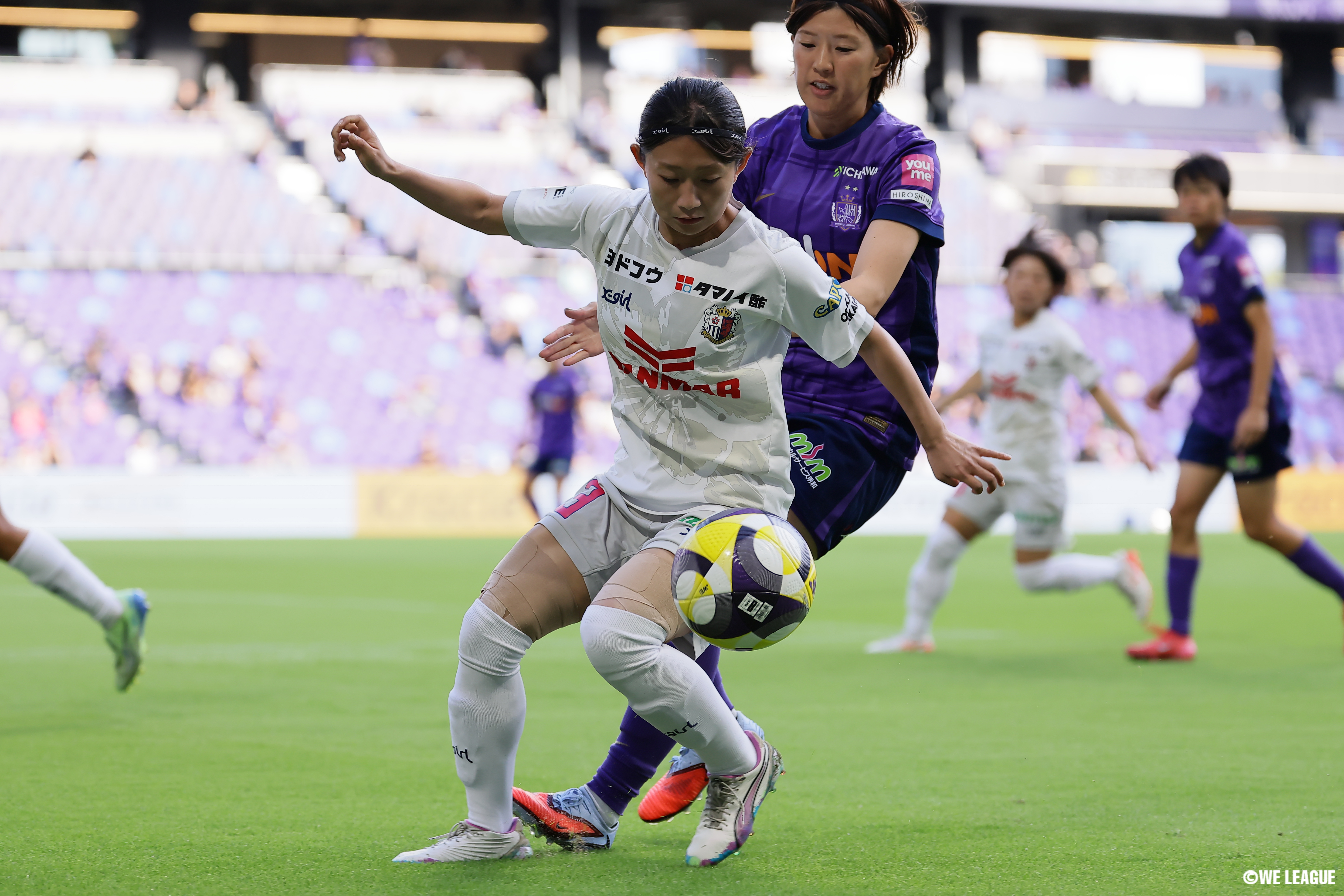 立ち上がりは広島に攻め込まれる場面もあったが、ここをしのぐと、10分過ぎからセレッソもボールを持つ時間を増やし、敵陣に入っていく。11分には、今節は右サイドバックで先発した浅山茉緩が中央へパスを送り、宝田沙織がダイレクトで裏へ狙う。惜しくも和田には通らなかったが、浅山が高い位置を取った中で前線と絡み、良い距離感で崩しを試みた。その後も狙いどころを絞った守備でボールを奪うと、奪ったボールは丁寧につないで組み立てる。試合前、「自分たちの良さをしっかり出すことで、相手が自分たちに合わせてくる、それぐらい強気でいきたい」と話していた松田岳夫監督だったが、そうした気概を選手たちがピッチで表現。19分には、この試合は左サイドハーフで先発した北原朱夏が高い位置でボールを奪い、宝田が遠めの位置からミドルシュート。枠には飛ばなかったが、両チーム通じて最初のシュートを放った。20分にも白垣うのを起点に北原へ縦パスが入り、北原の落としを受けた宝田が背後へスルーパス。惜しくも百濃実結香には通らなかったが、中央をテンポよく割っていく攻撃を見せた。20分過ぎからは再び広島にペースを握られると、セットプレーを与える機会も増えていく。すると38分、広島に先制を許してしまう。FKから李誠雅にバックヘッドを決められた。前半、広島に許したシュートはこの1本だっただけに、セレッソとしては悔やまれる失点となった。もっとも、自分たちが放ったシュートも宝田の1本のみ。後半に向けて、より深い位置で攻撃を仕掛けていく課題も見られた前半となった。