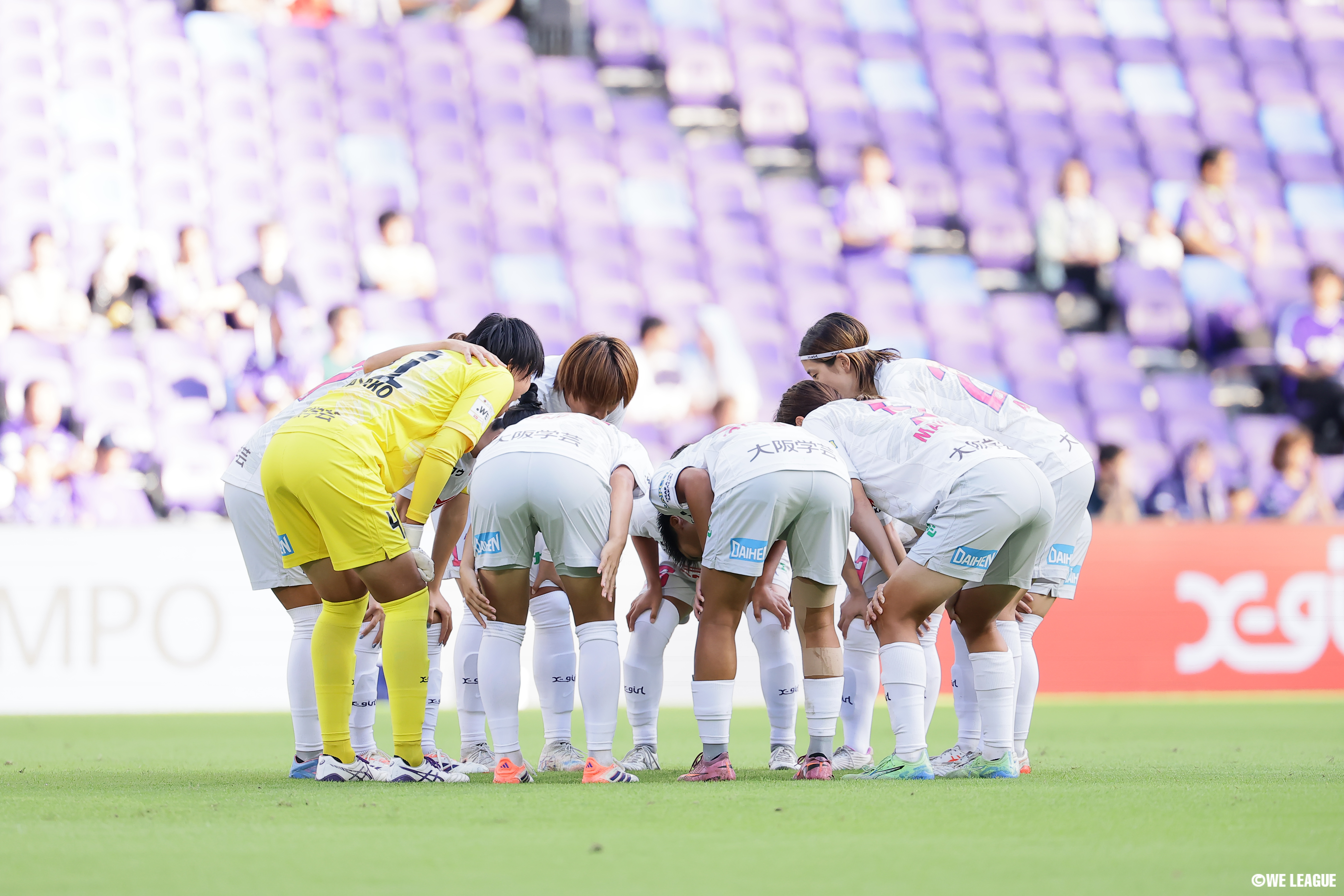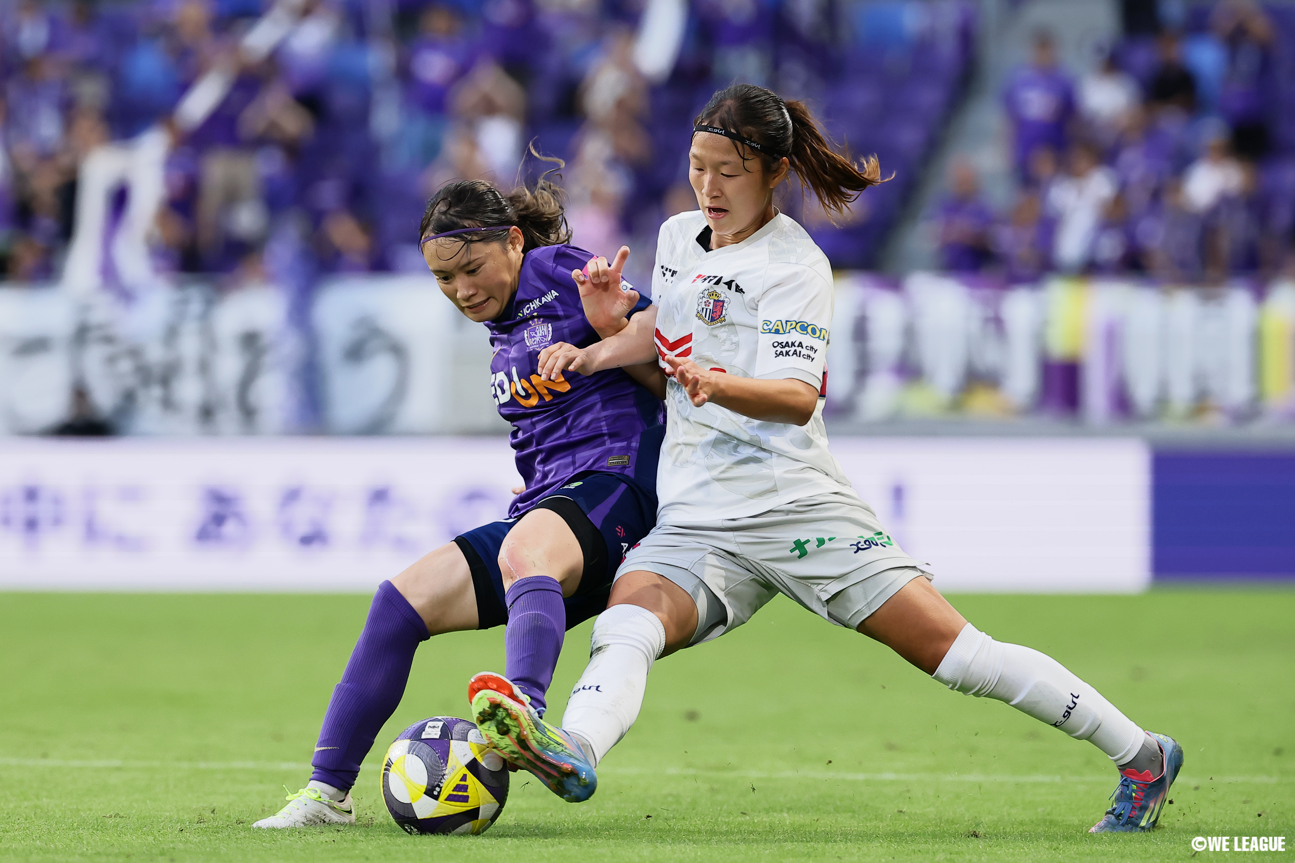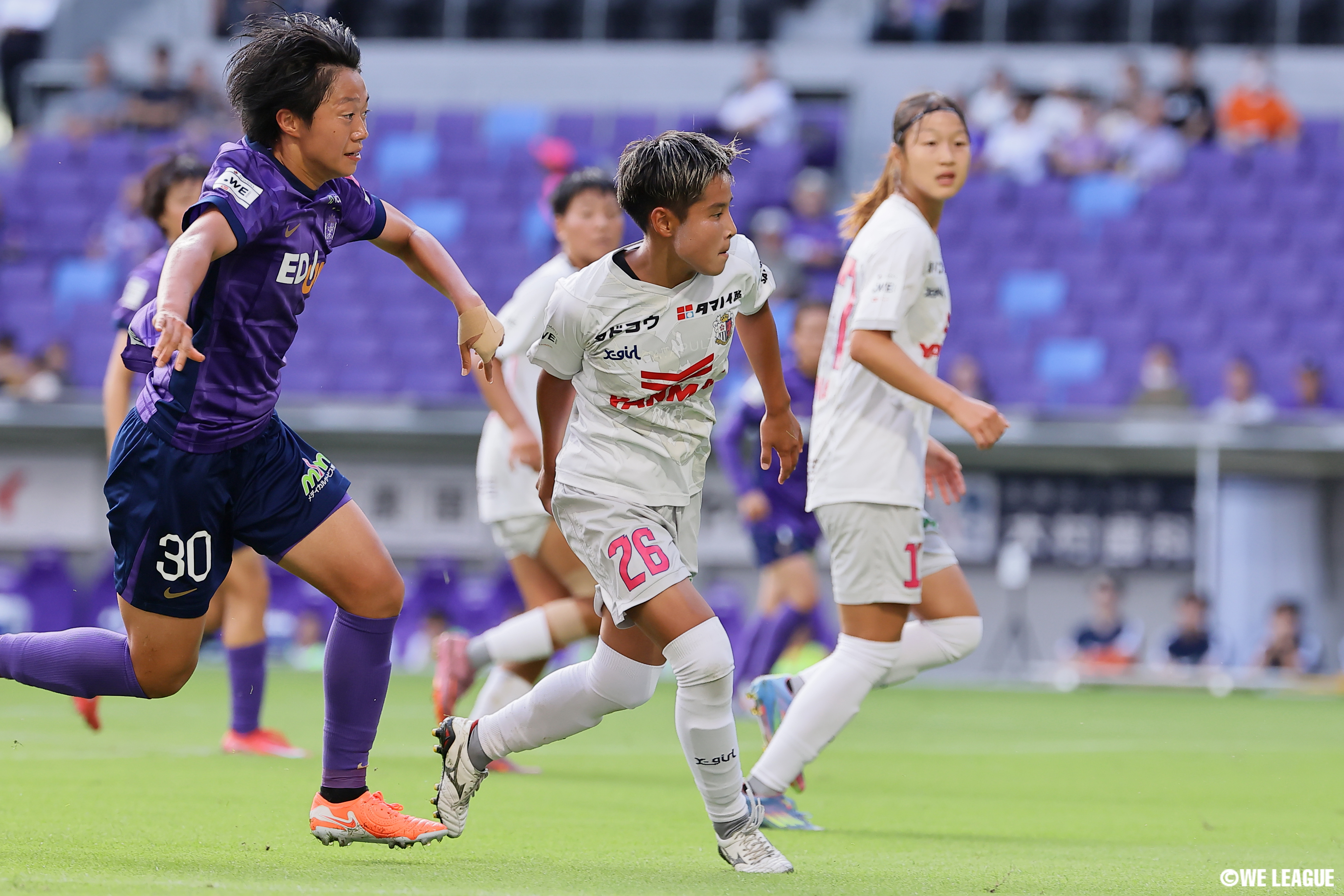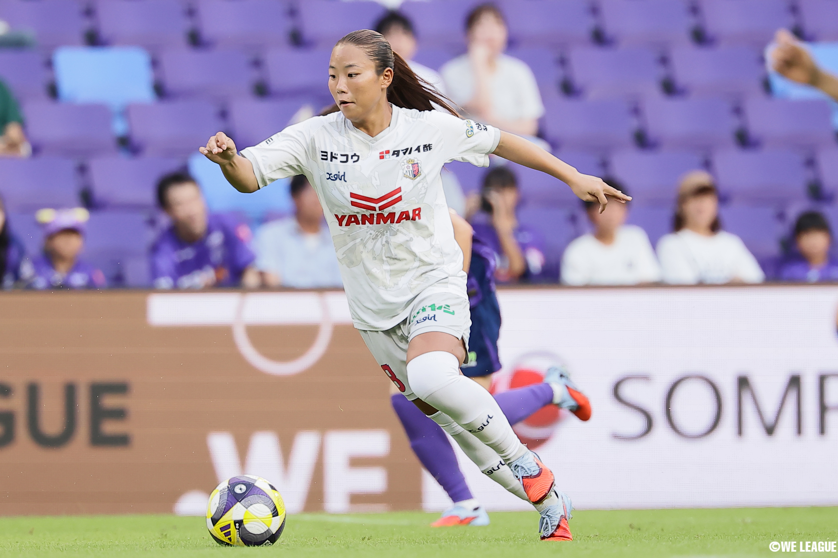 立ち上がりは広島に攻め込まれる場面もあったが、ここをしのぐと、10分過ぎからセレッソもボールを持つ時間を増やし、敵陣に入っていく。11分には、今節は右サイドバックで先発した浅山茉緩が中央へパスを送り、宝田沙織がダイレクトで裏へ狙う。惜しくも和田には通らなかったが、浅山が高い位置を取った中で前線と絡み、良い距離感で崩しを試みた。その後も狙いどころを絞った守備でボールを奪うと、奪ったボールは丁寧につないで組み立てる。試合前、「自分たちの良さをしっかり出すことで、相手が自分たちに合わせてくる、それぐらい強気でいきたい」と話していた松田岳夫監督だったが、そうした気概を選手たちがピッチで表現。19分には、この試合は左サイドハーフで先発した北原朱夏が高い位置でボールを奪い、宝田が遠めの位置からミドルシュート。枠には飛ばなかったが、両チーム通じて最初のシュートを放った。20分にも白垣うのを起点に北原へ縦パスが入り、北原の落としを受けた宝田が背後へスルーパス。惜しくも百濃実結香には通らなかったが、中央をテンポよく割っていく攻撃を見せた。20分過ぎからは再び広島にペースを握られると、セットプレーを与える機会も増えていく。すると38分、広島に先制を許してしまう。FKから李誠雅にバックヘッドを決められた。前半、広島に許したシュートはこの1本だっただけに、セレッソとしては悔やまれる失点となった。もっとも、自分たちが放ったシュートも宝田の1本のみ。後半に向けて、より深い位置で攻撃を仕掛けていく課題も見られた前半となった。