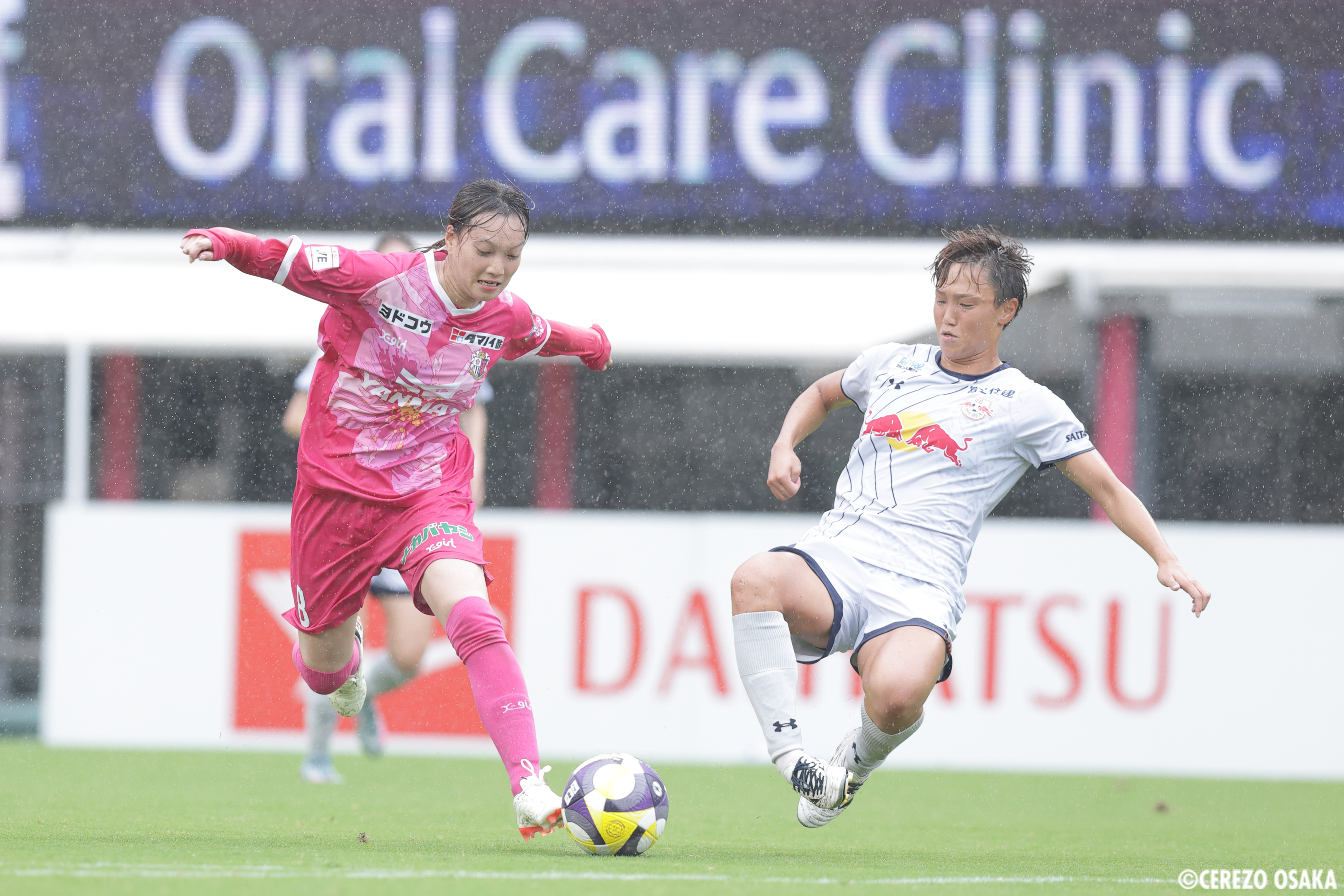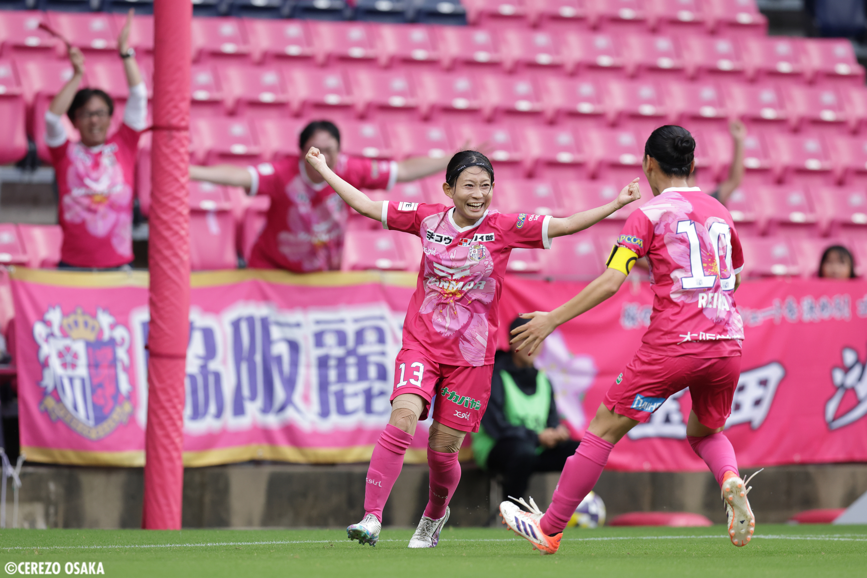後半は開始から選手を入れ替えてきた大宮の攻勢を受けると、48分、50分と立て続けにピンチも迎えたが、いずれもGK名和咲香が手を伸ばしてゴールを守った。後半の立ち上がりはボール保持で時間が作れず、大宮のターンが続く。前半は機能していた田子と浅山の2トップにもボールが入らず、シュートまでいけない。大宮のセットプレーの機会も増えるなど、セレッソにとっては苦しい時間帯が続いたが、ここをしのぐと、72分、田子が強烈なシュートを放ち、大宮ゴールを脅かす。ここで得たCKから決定機。ただし、脇阪のキックにニアで合わせた白垣のヘディングは惜しくもクロスバーを叩いた。すると76分、大宮に一瞬の隙を突かれて失点。相手の高い位置でのスローインの流れから、途中出場、田中聖愛のクロスに齊藤夕眞に頭で決められた。前半の内容を考えると引き分けでは終われないセレッソは、ここから再びギアを上げる。82分、GK名和のロングキックを田子が収め、この試合5本目のシュートを放つ。ここはGKの好セーブに阻まれたが、連続してCKを獲得するなど押し込むと、85分、勝ち越しに成功。百濃が左サイドをドリブルで突破しクロスを上げると、ペナルティーエリア内に田子、浅山、高和、脇阪、宝田と5人が入り、田子の落としを受けた宝田がゴールへ向かう。DFに防がれたこぼれ球を拾った浅山がシュート。DFにブロックされたセカンドボールに反応した脇阪がトラップすると、これが百濃への絶妙なパスになり、走り込んだ百濃が豪快にネットに蹴り込んだ。厚みのある攻撃で再びリードしたセレッソは、90分には途中出場の和田麻希がドリブルから巧みなフェイントで相手を外してシュート。クロスバーをかすめて外れたが、貪欲に3点目を狙うと、後半アディショナルタイムの大宮の反撃も抑えて2-1で勝利。連敗を5で止め、今シーズン2勝目を掴んだ。