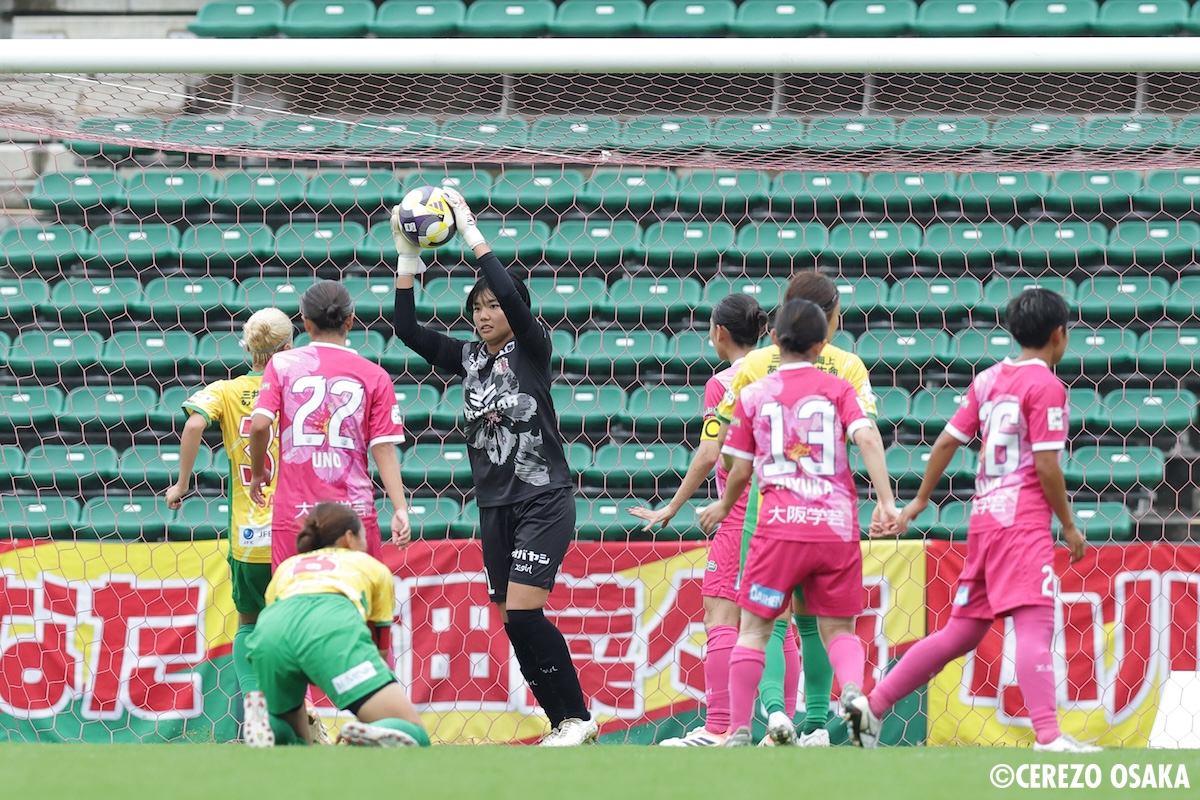 後半は守備から入ったセレッソ。前半立ち上がりのようなハイプレスではなくミドルブロックを組み、ある程度、千葉Lに持たせつつ、中央に入ってきたボールを挟み込む。千葉Lに攻撃の形を作らせずにいると、次第にボールを持つ時間も増やし、敵陣に入っていく。57分、百濃が倒されて得たFKでは、宝田が直接シュート。わずかに枠を外れたが、鋭く速い弾道にスタジアムが沸いた。64分には、左サイドで受けた百濃がカットインしてシュート。得意の形に持ち込むと、直後にセレッソが追加点。相手の組み立て段階でのバックパスをカットした和田がサイドから中央へ運ぶと、ブロックに来た相手DFを2人かわして左足でシュート。GKも届かない逆サイドのコースへ見事に決めた。昨シーズン終盤からブレイクの兆しを見せていた背番号29。大器の覚醒を思わせる鮮やかなゴールだった。畳み掛ける松田監督は66分に2枚替え。中谷に代えて北原朱夏、田中に代えて高和芹夏を投入すると、この采配もズバリ的中。交代から6分後、スローインから和田、宝田、高和とつないで中央を突破。最後は高和のパスを受けた中西のクロスにファーで待ち構えた北原が右足ダイレクトで枠内に蹴り込んだ。このシーンではニアに田子と百濃が入るなど厚みのある攻撃を仕掛けたセレッソ。北原の今季3点目で試合を決定付けた。交代選手の躍動は止まらない。77分に入った宮本光梨が2分後、ゴール前、中央からドリブルで運んでフィニッシュ。惜しくも枠を捉えることはできなかったが、得点の可能性を感じさせるミドルシュートを放った。終盤は千葉Lの反撃も受けたが、7試合ぶりの無失点を達成。2点目の直前、チームを助けるビッグセーブを見せたGK名和咲香は、WEの舞台で初めてクリーンシートによる勝利を掴んだ。