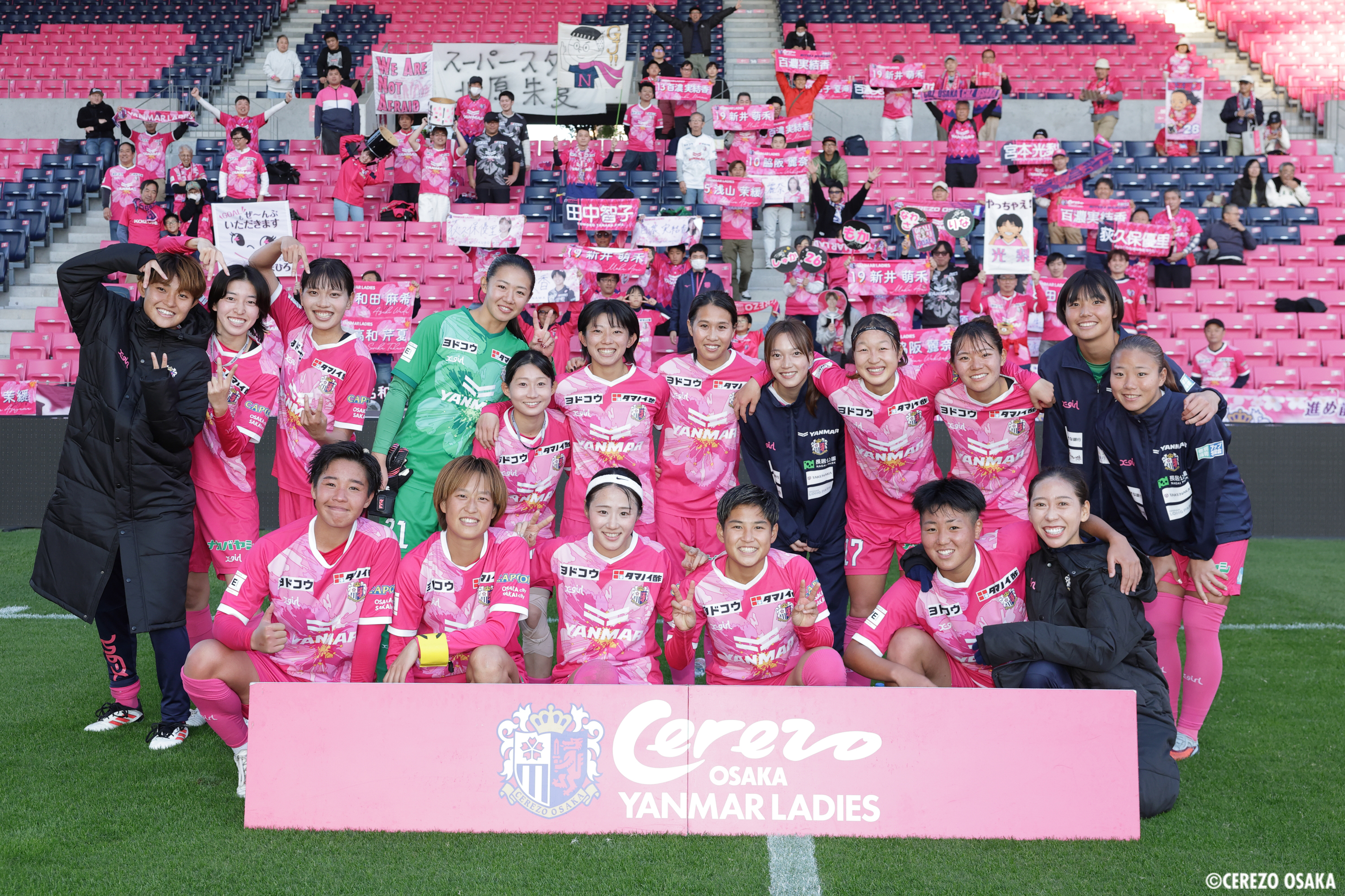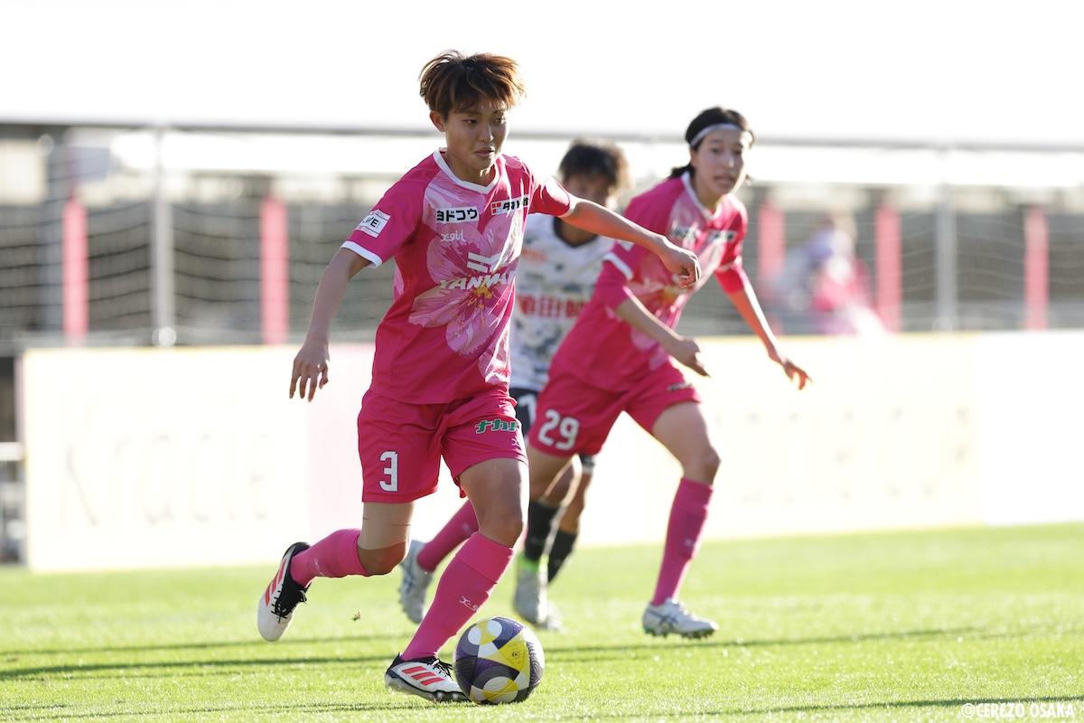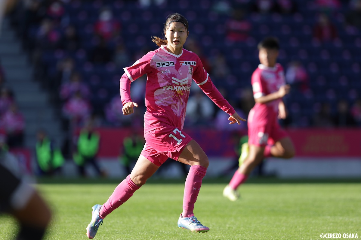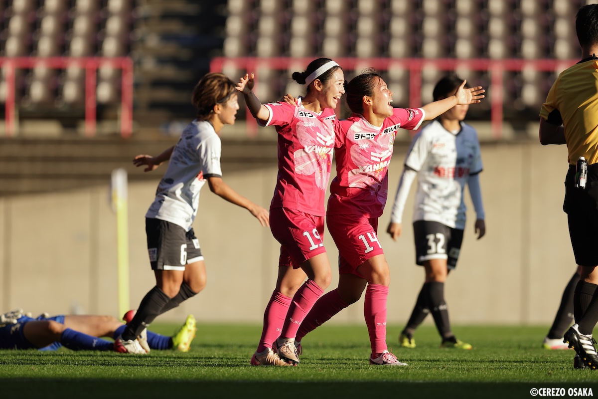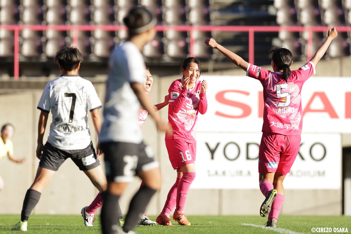 後半開始から松田岳夫監督は2枚替え。前半について、「運動量が足りず、切り替えも遅く、自分たちの良さを出すというより相手を探りながら試合が進んでしまった」と総括した指揮官は、脇阪麗奈と田子に代えて宮本光梨と新井萌禾を投入。交代した2選手の出来が悪いわけではなかったが、「より運動量を増やし、フォワードからしっかりプレッシャーをかけて、限定してボールを高い位置で奪うコンセプト」(松田監督)を再度、チームに注入した。すると後半開始早々、浅山茉緩と新井が高い位置でプレス。挟んでボールを奪い、新井がシュートを放つと、50分に決定機。左サイドから中央に入った百濃が宝田のパスを受けてスルスルとボックス内に進入してシュート。ただし、DFにブロックされたボールはわずかに枠を外れた。52分には、宮本がミドルシュート。枠を捉えたが、相手GKの好セーブに阻まれた。後半は、最初のプレーでスイッチが入ったセレッソが押し込んだ状態で試合を進めると、67分に3人目の選手交代。米田に代えて中西ふうを右サイドバックに投入。より攻撃で特長の出せる選手を送った。77分には和田に代わり高和芹夏が入ると、後半の猛攻が実ったのは79分。中央で起点を作った新井が前を向いてドリブル。前方を走る宝田へパスを送ると、受けた宝田もさらに左サイドを追い越してきた中谷へスルーパス。中谷の正確なクロスに合わせたのは、入ったばかりの高和。決定的なヘディングシュートはGKに防がれたが、その跳ね返りを中西がダイレクトボレー。抑えの利いたシュートをゴールに突き刺した。「相手のポジションを崩したり、駆け引きがあってのゴールだった。全員で取った素晴らしいゴール」と指揮官も称賛した全員が沸き上がる得点で勢いに乗ると、87分にはCKからピンチもあったが、ここをしのいだ試合終盤に波状攻撃を仕掛け、迎えた90+3分。勝ち越しに成功。相手のクリアボールを高い位置で拾った四本帆夏が相手をかわして左足でシュートを放つと、GKがはじいたところに詰めたのは新井。「チームメイトを信じて、『(パスが)出てくるだろうな』ではなく、『出てくる』という意識で常にゴール前に走り込んでいました」と試合後に振り返ったように、シュートを打った瞬間に動き出し、こぼれ球に誰より早く反応。ネットを揺らした。怪我から復帰後、この試合がホーム・ヨドコウ桜スタジアムでの初戦。「2カ月間ずっと悔しい思いをしてきて、この気持ちを表現するのは自分次第でした。試合に出たら絶対に自分が活躍して、勝利に貢献するんだっていう気持ちが大きかったです。自分の気持ちにも応えられたと思います」と安堵の表情を浮かべた。