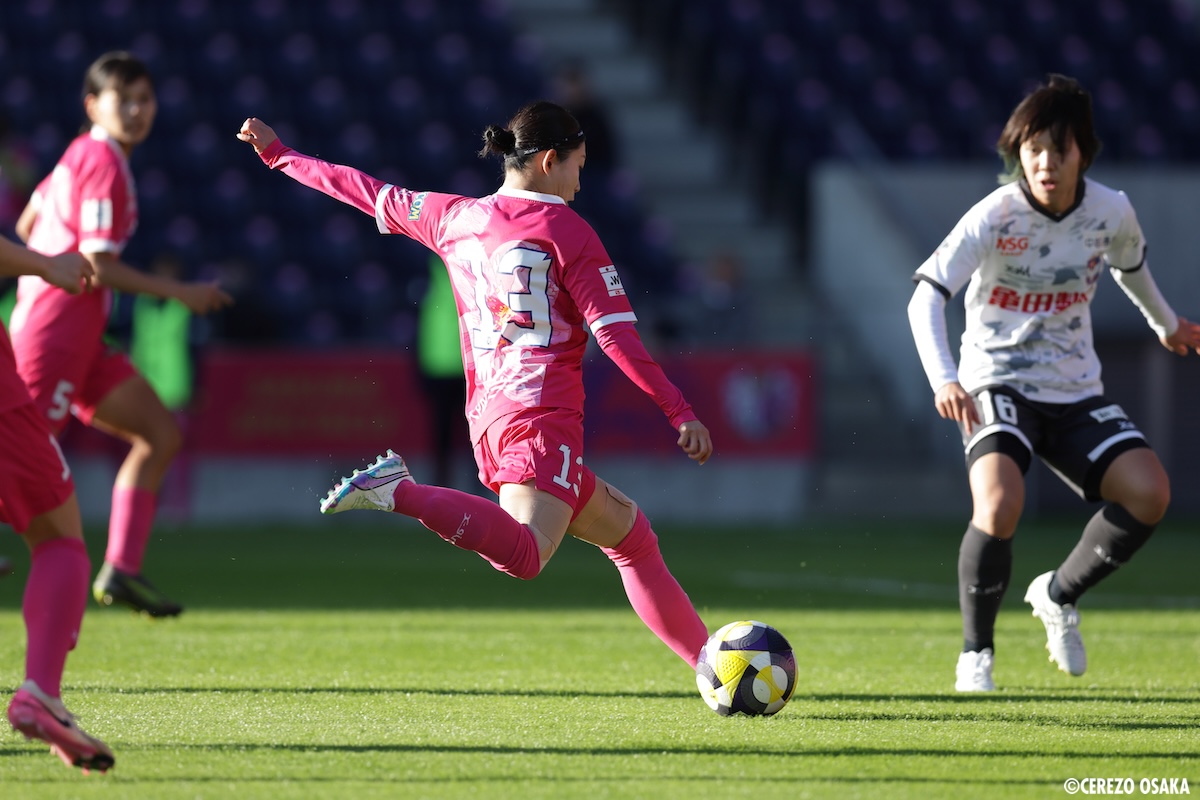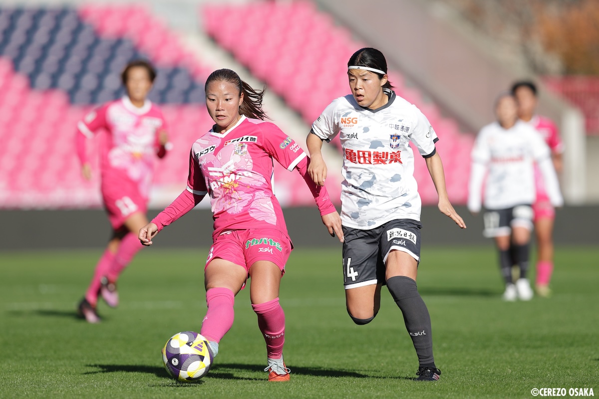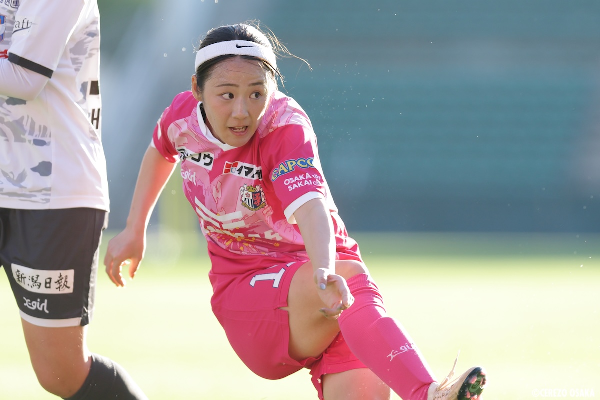 立ち上がりからボールを握ったのはセレッソ。4分、右サイドで和田麻希、田子とつないで崩し、最後は宝田沙織がフィニッシュ。ファーストシュートを放つと、直後には左サイドから百濃実結香が突破。両サイドからゴールに迫る。ただし、悪い失い方からカウンターも受けると、12分、CKを直接決められ失点。リーグ戦での対戦時もCKから2失点を喫したセレッソとしては、悔やまれる形だった。その後は新潟Lが3バックを生かして幅を取りながらボールをつなぐ。序盤とは立場が入れ替わった状態となったが、18分、セレッソは中盤で奪い、宝田のパスを受けた田子がシュート。良いコースへ飛んだが、わずかに枠を外れた。続く19分にも高い位置でボールを奪取。宝田のパスから右サイドを抜けた田子のクロスにニアで百濃が潰れ、ファーで中谷莉奈がフィニッシュ。崩した形だったが、シュートはクロスバーを越えた。ここから再びボールを握る時間も増えたセレッソだが、新潟Lの守備を破るには至らない。失点以降は相手にチャンスを作らせていなかったが、35分、1本のフィードから川澄奈穂美に裏を取られ、クロスから新潟Lに決定機。崩された形だったが、中で合わせた新堀華波のシュートが枠を外れて事なきを得た。38分にもサイドからピンチを招くなど前半の終盤は押し込まれる展開も続いたが、2点目は許すことなく前半を終えた。