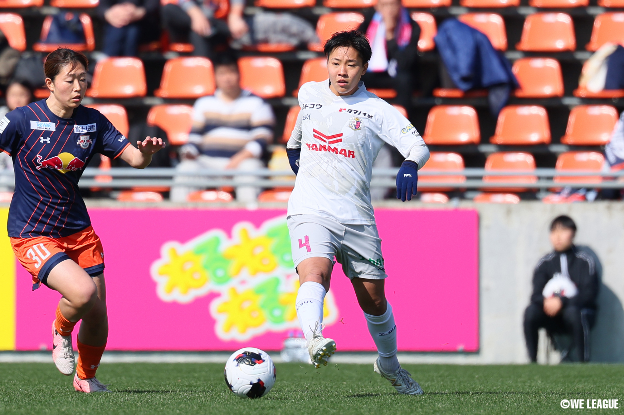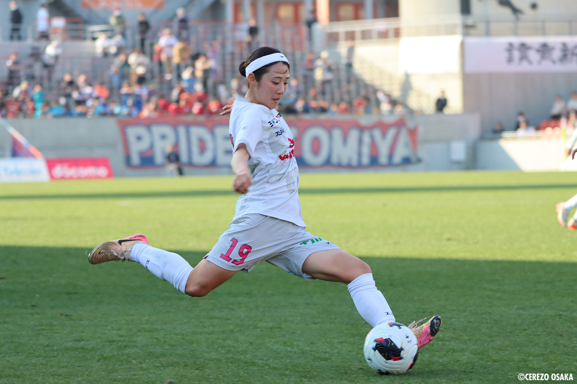 立ち上がりは一進一退の攻防が続いた中、最初にチャンスを掴んだのはセレッソ。7分、右サイドハーフで先発した和田麻希が巧みなタッチで相手を交わして前を向くと、そのままドリブルで運んでスルーパス。百濃実結香の落としを受けた宝田沙織が走り込んで左足でシュート。流れるような崩しからフィニッシュを迎えたが、わずかにポスト右に外れた。9分には大宮にクロスからチャンスを作られたが、ここはGK山下莉奈が好セーブで守る。11分にはセレッソに決定機。右サイドを崩して和田がドリブル。クロスに逆サイドで合わせたのは百濃。枠を捉えたヘディングシュートを放ったが、大宮GK福田史織のビッグセーブに防がれた。互いに攻め合い、ゴール前のシーンが多いスリリングな展開で幕を開けた試合は17分、スコアが動く。大宮の左サイドからのライナー性の速いクロスに対し、中央で西尾葉音にヘディングで合わせられ、ネットを揺らされた。クロス、シュートとも相手を褒めるべき得点ではあったが、その前に起点を作られた場面で潰しておきたいシーンでもあった。決して悪い入りではなかったセレッソは22分にも和田、田子夏海が連続してシュート。37分には脇阪麗奈のパスから背後を取った浅山茉緩がクロスを上げて獲得したCKからチャンス。宝田の低くて速いキックがファーに流れたところに中谷莉奈が飛び込んだが、シュートはDFにブロックされた。39分にもチャンス。浅山がキープして右サイドへ展開。高い位置を取った右サイドバックの米田博美が縦に突破してクロスを上げると、ファーで脇阪が折り返したが、ゴールとはならず。序盤から攻守の切り替えが激しい試合は前半、セレッソが相手ゴールに向かうシーンを多く作ったが、ワンチャンスを大宮に決められて、1点ビハインドで折り返した。