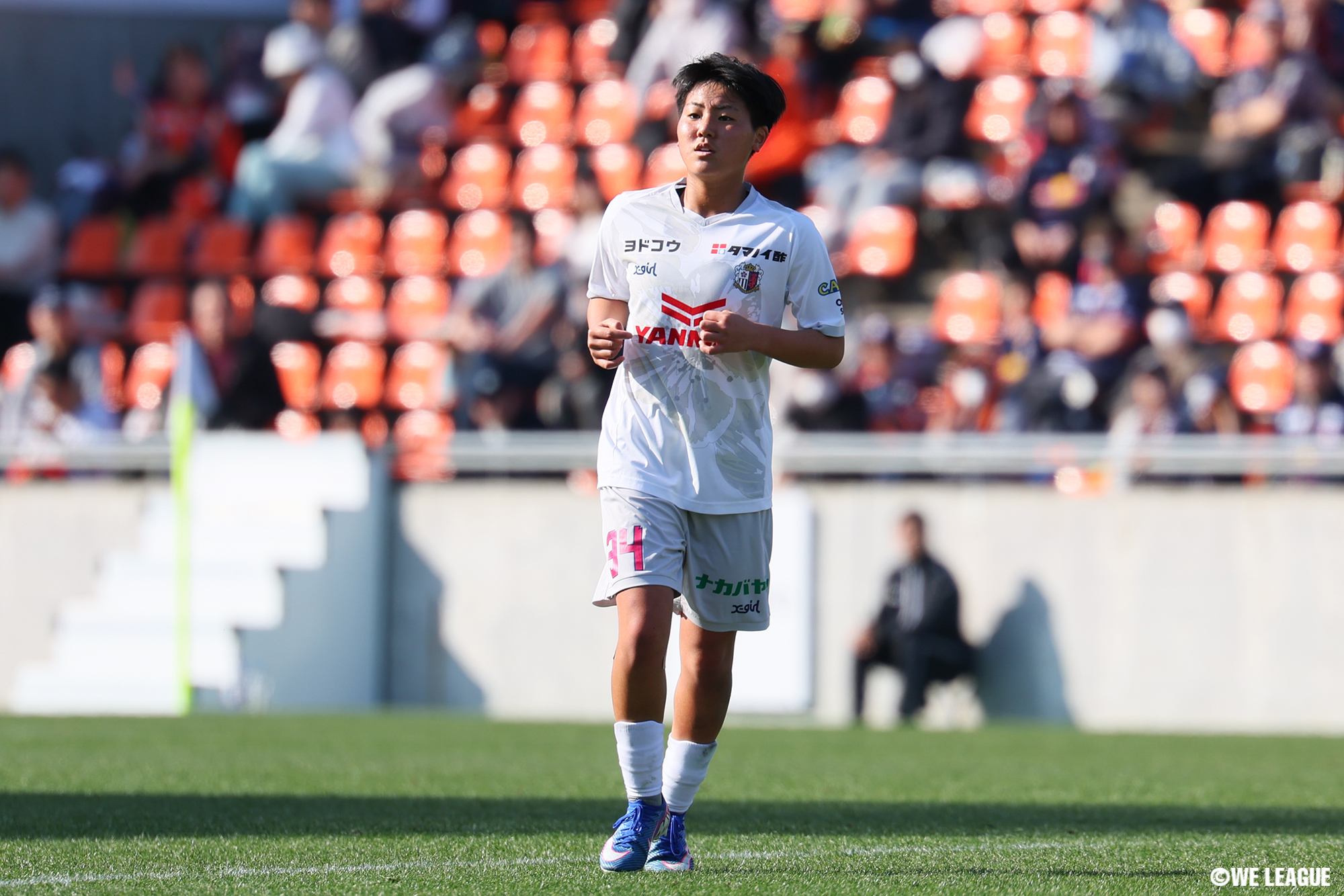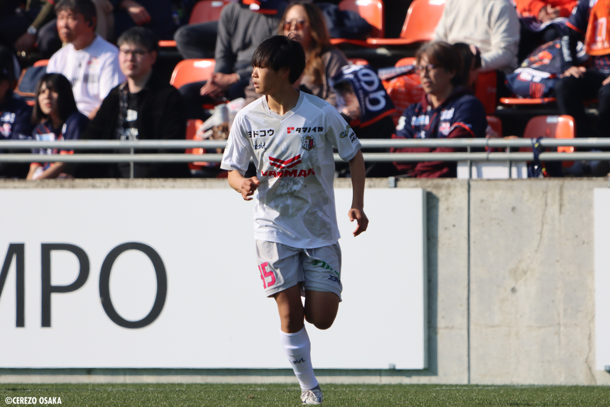 両チームメンバー交代なしで迎えた後半は立ち上がり、勢いよく前に出てきた大宮に対し、セレッソは受けに回る時間もあったが、ここをしのぐと53分、田子がやや遠めの位置から思い切ってシュート。ウィンターブレイク前、最後の試合となったINAC神戸レオネッサ戦では、ハーフェーライン付近から放ったロングシュートによるゴールが「11・12月度のWEリーグ月間ベストオフェンス賞」に選出された田子。どのレンジからでも狙える自信をこの試合でも感じさせた。ここからセレッソが敵陣でプレーする時間を増やすと、56分には百濃がペナルティーエリア内に進入。相手DFのタックルに倒されたが、笛は鳴らず。60分には百濃のインターセプトを起点に田子がキープし、田子のパスを受けた宝田がドリブルからシュート。試合前、「流れの中での崩しも積極的にいきたい」と話していた宝田。まさにこの場面ではDFに囲まれながらもフィニッシュに持っていく力強さを発揮したが、惜しくもポストに当たって同点とはならなかった。直後の61分に最初の選手交代。脇阪に代えて新井萌禾を投入。65分にはその新井が背後に飛び出してゴールに迫るシーンもあった。77分にも和田が右サイドから中央へ入り、左足でシュート。何とか追い付きたいセレッソは81分、四本帆夏と同じ高校1年生、育成TOP可選手のFW池田柚葉を投入。池田にとってこの試合がWEデビューとなった。田子と2トップを組む形でピッチに入り、何とか爪痕を残したかったが、終盤は選手交代を機に大宮が再び前への圧力を強める。それでも2失点目は防ぐと最終盤はセレッソが再び敵陣に迫ったが、この試合では最後までネットを揺らすことができず、0-1で試合は終了。終始、果敢に戦う好ゲームを演じたが、スコアだけが足りなかった。
