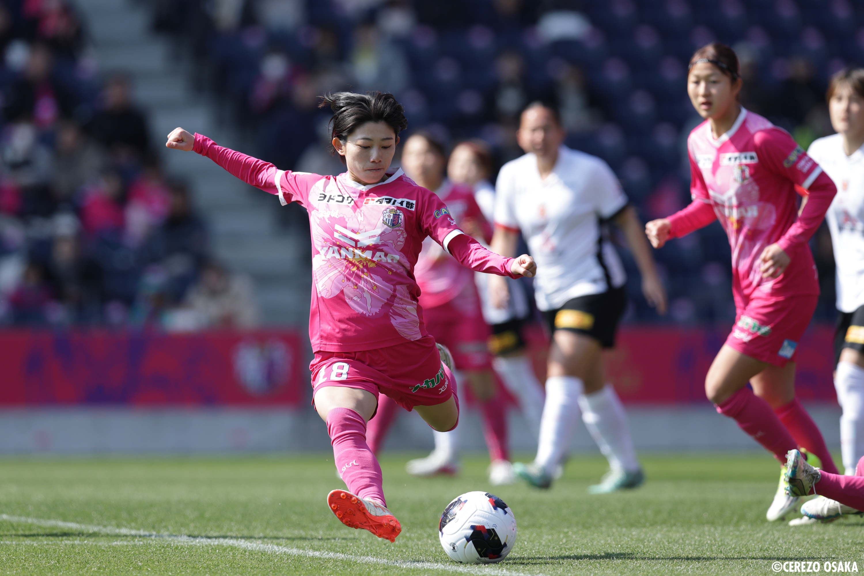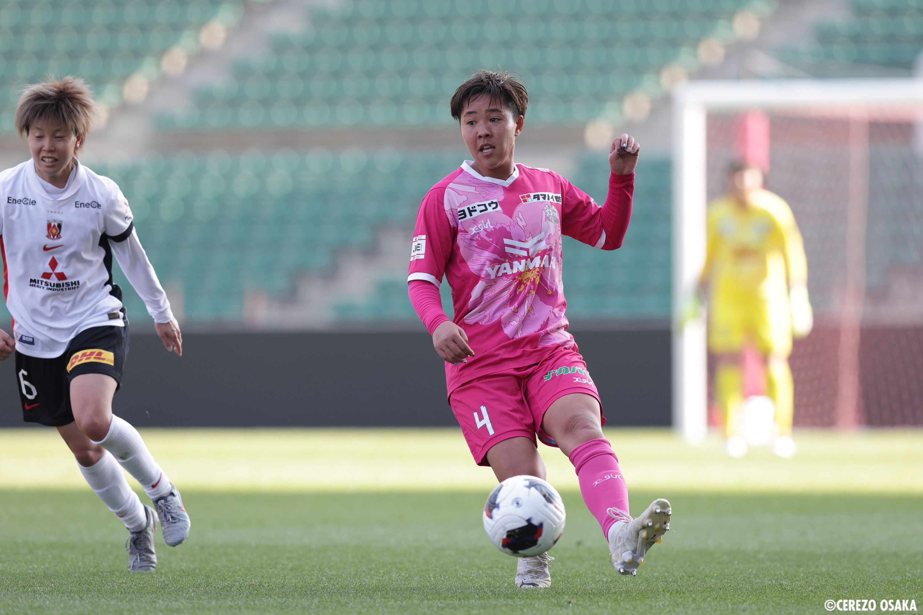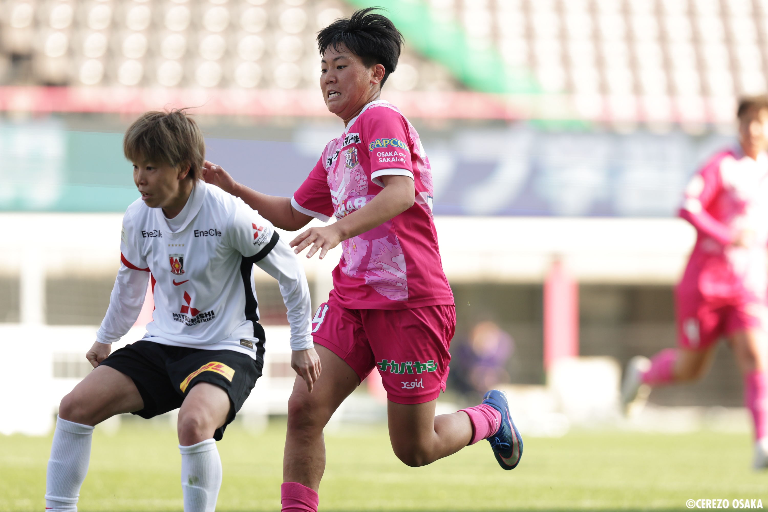 前節でグループステージ突破を決めたとは言え、「自分たちが成長していることを次のゲームで証明したい」(松田岳夫監督)と浦和戦2連勝を目指して臨んだ今節は、前節と同様、立ち上がりは守勢に回る時間が長い展開に。試合開始前の時点でグループステージ突破の可能性を残していた浦和が縦に速い攻撃でゴールに向かってきたが、セレッソの選手たちの戻りも速く、ゴール前ではしっかり体を寄せて対応。決定的な形は作らせない。浦和のアンカー、伊藤美紀へのパスコースを消しながらプレスをかけると、次第に高い位置で奪う回数も増え始め、17分、脇阪麗奈のクロスが相手のオウンゴールを誘いかける。21分にはCKのセカンドボールを拾った荻久保が左足でミドルシュート。荻久保は31分にも高い位置でカットし、遠めの位置からミドルシュート。積極的にゴールに迫った。33分、セレッソに決定機。背後のスペースに飛び出した百濃実結香へ宝田沙織が絶妙なパスを届けると、百濃がドリブルで運んでGKとの1対1を迎えかけたが、戻ってきたDFの寄せにも遭い、惜しくもシュートはサイドネット。先制とはならなかった。すると、直後の35分に失点。筒井が中盤に出したパスをカットされると、浦和のショートカウンターを受け、最後はサイドを崩された形から島田芽依に決められた。セレッソとしては次第に自分たちのペースに持ち込みかけていた時間帯だっただけに、もったいない失点となった。41分、脇阪が高い位置で奪って運ぶと、左サイドを駆け上がってきた中谷莉奈がクロス。ファーで田子夏海が合わせたが、うまくヒットしなかった。このまま0-1で折り返したが、シュート数では上回り、内容としては悪くない前半だった。