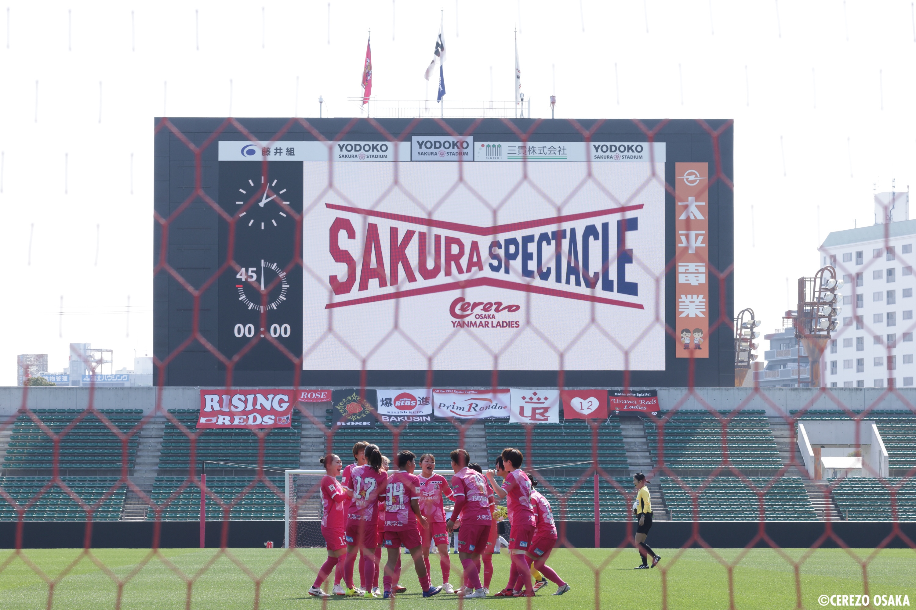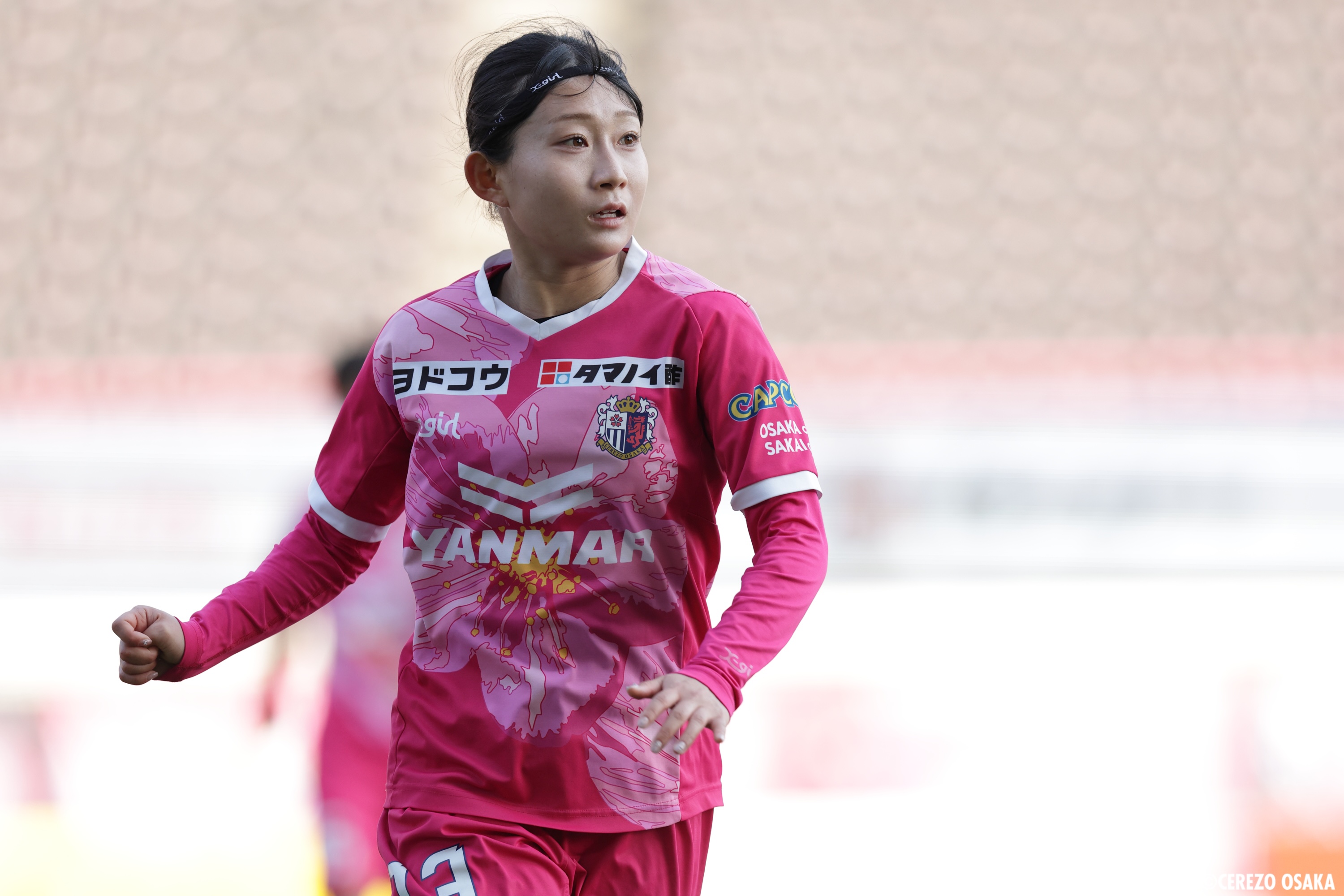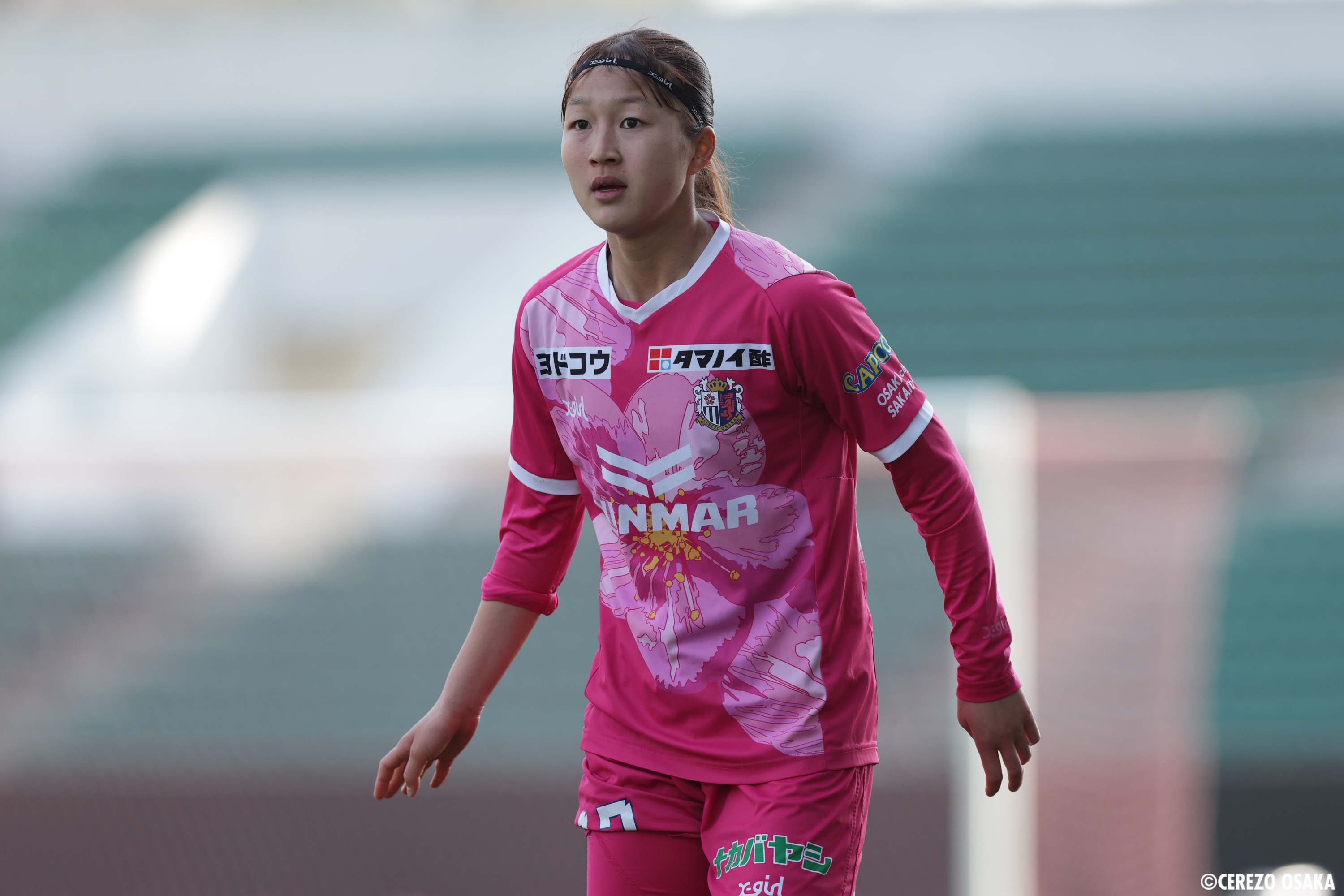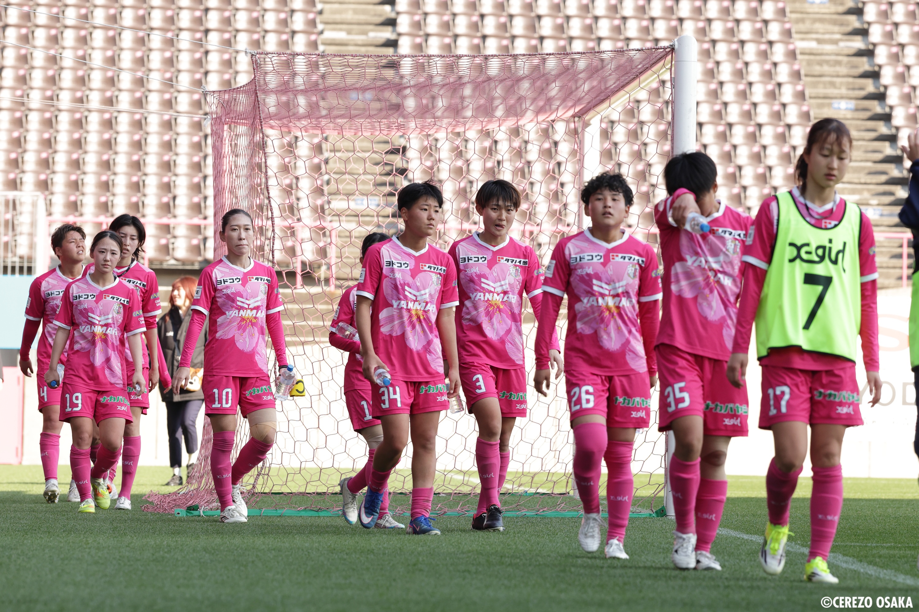 前節でグループステージ突破を決めたとは言え、「自分たちが成長していることを次のゲームで証明したい」(松田岳夫監督)と浦和戦2連勝を目指して臨んだ今節は、前節と同様、立ち上がりは守勢に回る時間が長い展開に。試合開始前の時点でグループステージ突破の可能性を残していた浦和が縦に速い攻撃でゴールに向かってきたが、セレッソの選手たちの戻りも速く、ゴール前ではしっかり体を寄せて対応。決定的な形は作らせない。浦和のアンカー、伊藤美紀へのパスコースを消しながらプレスをかけると、次第に高い位置で奪う回数も増え始め、17分、脇阪麗奈のクロスが相手のオウンゴールを誘いかける。21分にはCKのセカンドボールを拾った荻久保が左足でミドルシュート。荻久保は31分にも高い位置でカットし、遠めの位置からミドルシュート。積極的にゴールに迫った。33分、セレッソに決定機。背後のスペースに飛び出した百濃実結香へ宝田沙織が絶妙なパスを届けると、百濃がドリブルで運んでGKとの1対1を迎えかけたが、戻ってきたDFの寄せにも遭い、惜しくもシュートはサイドネット。先制とはならなかった。すると、直後の35分に失点。筒井が中盤に出したパスをカットされると、浦和のショートカウンターを受け、最後はサイドを崩された形から島田芽依に決められた。セレッソとしては次第に自分たちのペースに持ち込みかけていた時間帯だっただけに、もったいない失点となった。41分、脇阪が高い位置で奪って運ぶと、左サイドを駆け上がってきた中谷莉奈がクロス。ファーで田子夏海が合わせたが、うまくヒットしなかった。このまま0-1で折り返したが、シュート数では上回り、内容としては悪くない前半だった。