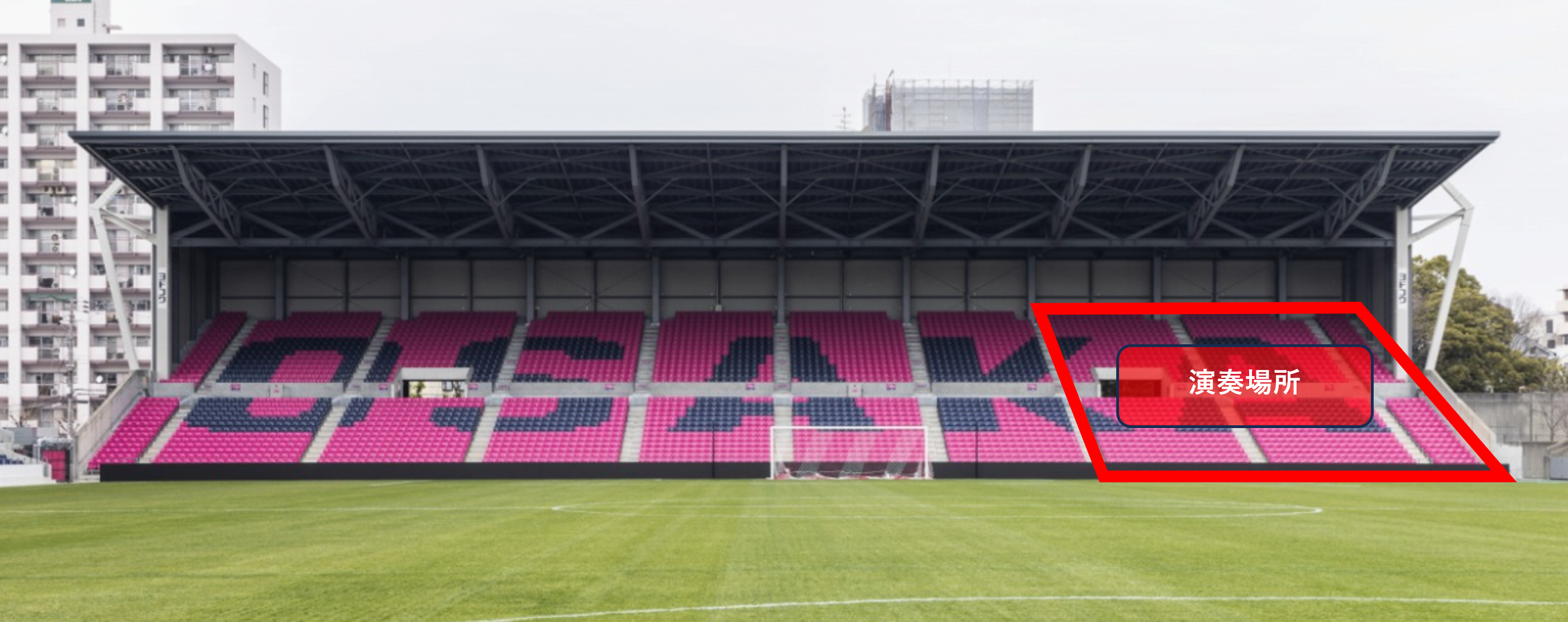 雨天が想定される為、大阪学芸吹奏楽部による演奏をホームゴール裏自由席の一部エリアにて行います。