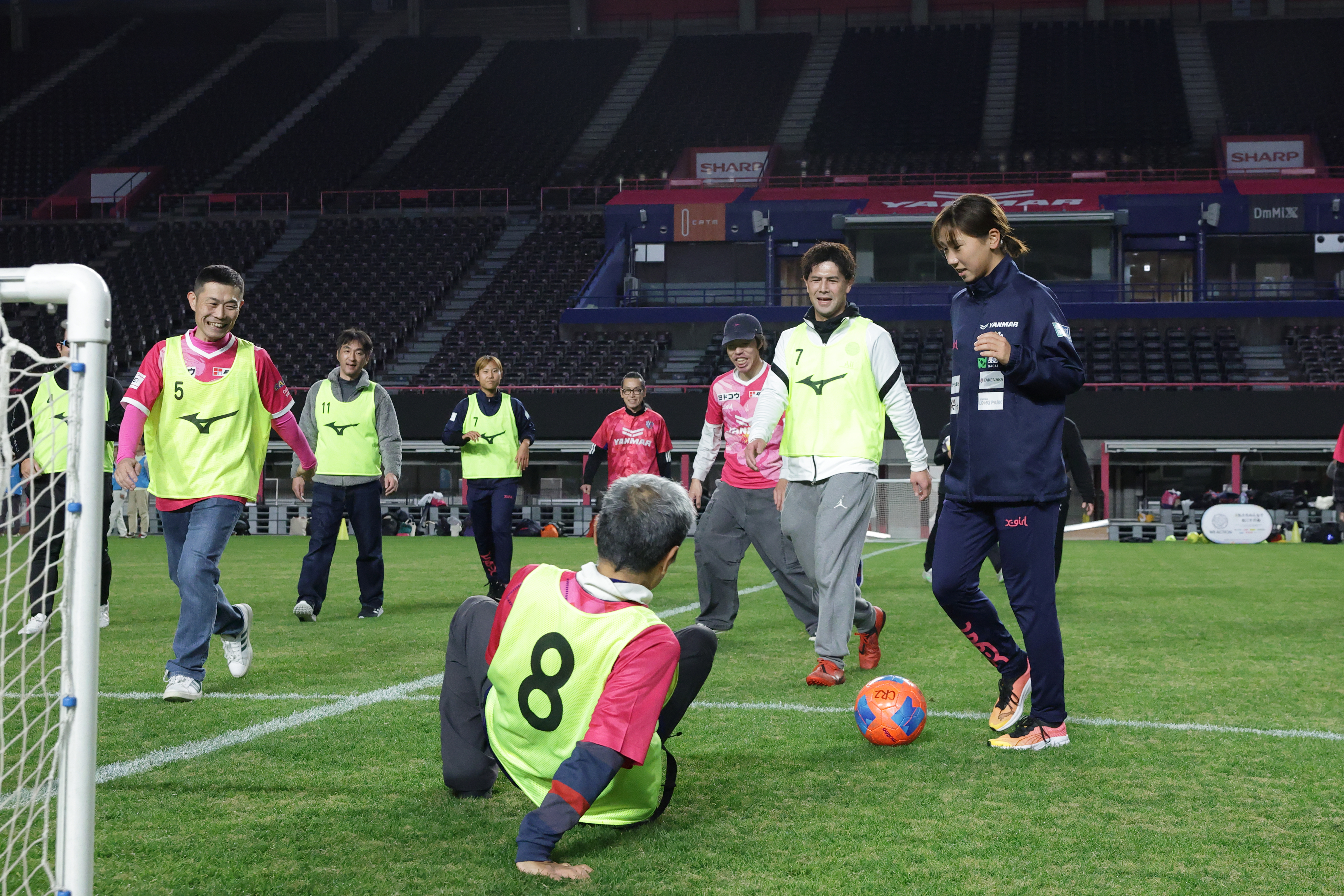 ホームゲームの試合後、ピッチにてウォーキングフットボールを実施いたしました。事前に募集した60名の参加者と荻久保優里選手、西中麻穂選手、石田心菜選手、吉田琉衣選手、丸橋祐介アンバサダー、古澤留衣レディース・エバンジェリストとともに、約1時間楽しみました。