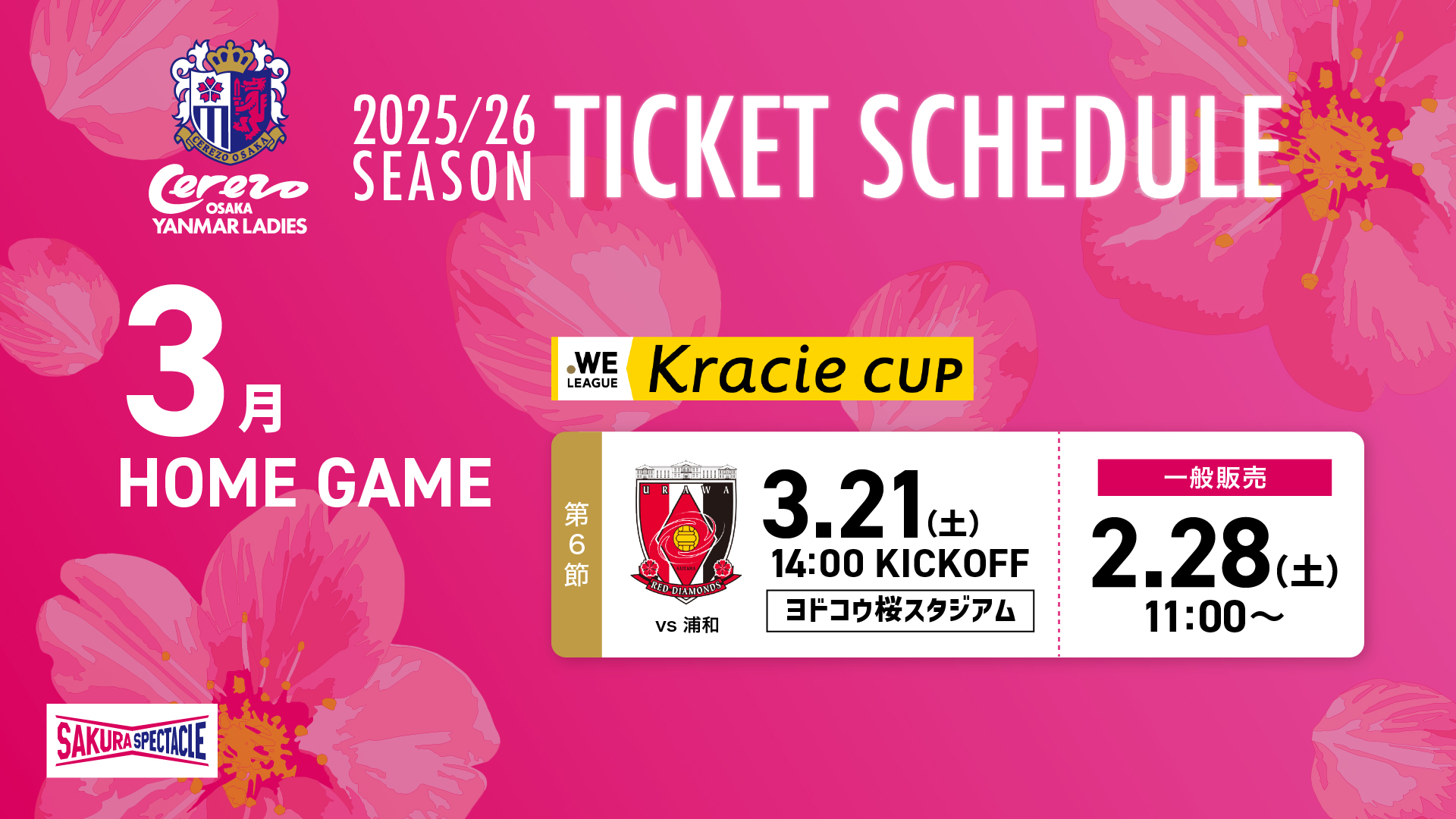 3月に開催するセレッソ大阪ヤンマーレディース ホームゲームのチケット販売についてお知らせいたします。