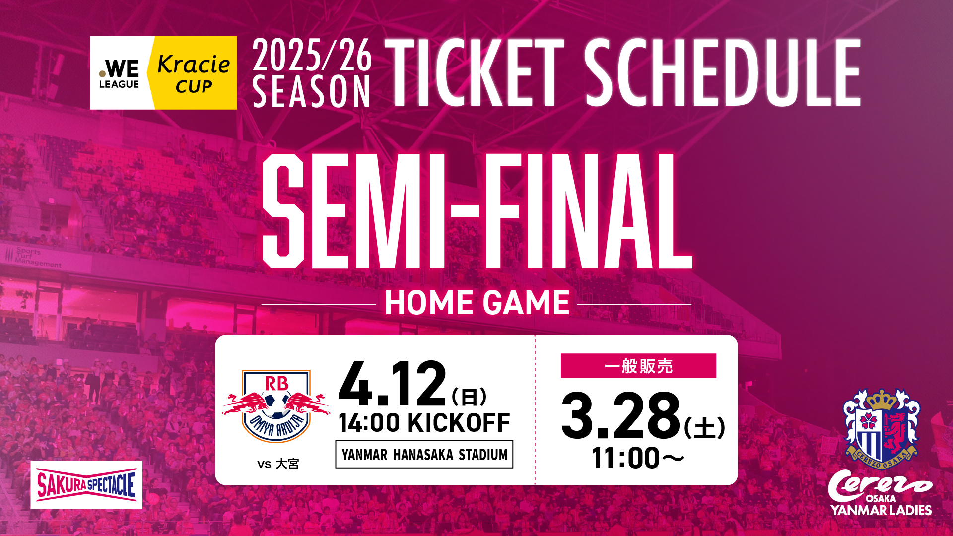 4/12(日)に開催する2025/26 WEリーグ クラシエカップ ノックアウトステージ準決勝 第1戦のチケット販売についてお知らせいたします。