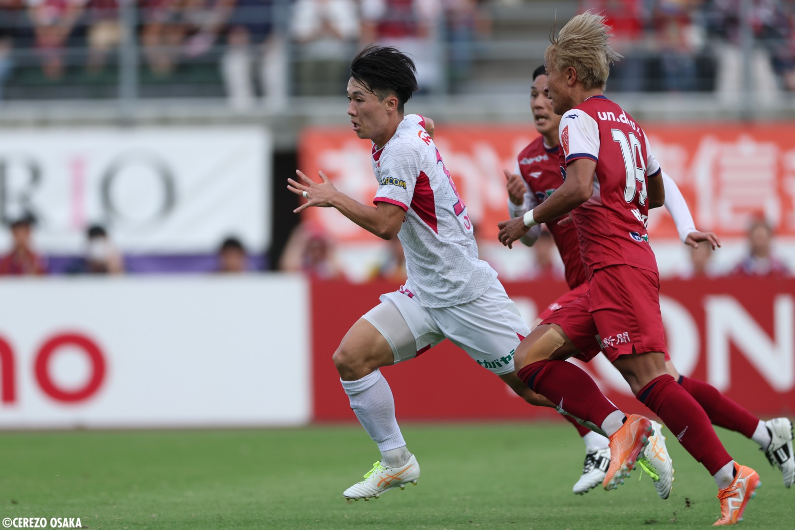 ハイプレスに苦しんだ前節の反省も生かし、今節は保持の局面で足元だけになるのではなく、効果的に背後も使って相手を裏返す。押し込んだ後の攻から守への切り替えも早く、10分、11分と連続して奥田が高い位置で奪ってチャンス。前者は田中駿汰から中島、後者は中島から本間につなぎ、シュートまで持っていった。特にカットインから際どいコースへ放った本間のフィニッシュはあと少しで先制という場面だった。18分には自陣でのつなぎで相手のプレスに遭い、高い位置でボールを奪われてネットを揺らされたが、ここはオフサイドで胸をなでおろす。すると直後の19分、奥田から田中に通したパスで相手のプレスを外すと、田中が一気に左サイドの背後へロングパス。本間が縦に突破してCKを獲得、20分、このセットプレーからセレッソが試合を動かす。キッカーの中島が低くて速い弾道のボールを蹴ると、ルカオのクリアミスを誘い、オウンゴールで先制に成功した。その後も長いボールも効果的に使って攻めるセレッソは、チアゴと本間の両サイド、さらには中島とラファエル ハットンの縦関係も機能し、チャンスを作る。ただし、30分過ぎからは岡山のマンツーマン気味のプレスに押されると、32分に失点。福井光輝がハットンに入れたボールをハットンがコントロールミスしたところから奪われ速攻を受け、最後はホームでの対戦でも決められた佐藤龍之介にカットインからミドルシュートを決められた。ここから岡山の勢いの前に守勢に回ったセレッソだが、勝ち越しゴールは許さず前半を終えた。