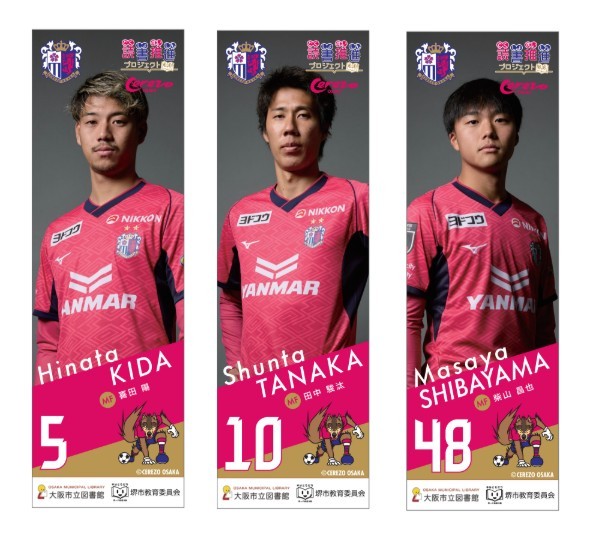 当ブックフェアにて配布予定の「セレッソ大阪オリジナルしおり」は、喜田陽選手、田中駿汰選手、柴山昌也選手の3種類となります。