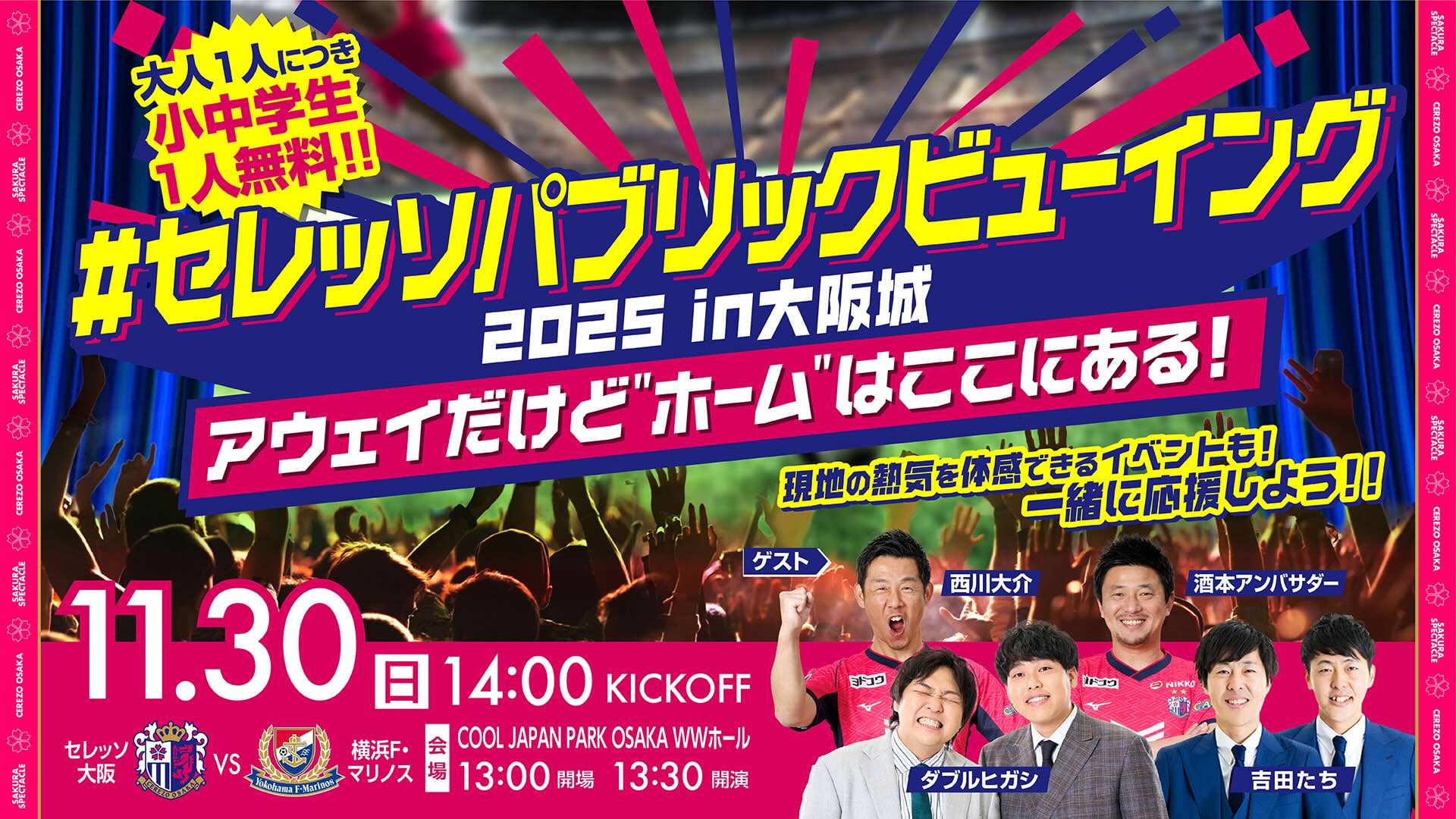 11/30(日)横浜FM戦にて、「#セレッソパブリックビューイング2025 in 大阪城〜アウェイだけど”ホーム”はここにある! 」を開催いたします。ホール内では、400インチの特大スクリーンと充実した音響・照明機材が揃う最高の環境での大迫力なサッカー観戦体験を味わっていただけます!本企画限定の体感イベントもご用意!声出し応援も問題ございませんので、ホームゲームのように盛り上がりましょう!