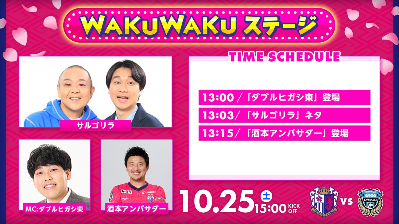 セレッソ大阪では2025シーズンも土日祝の試合を中心に、スタジアム場外でもWAKUWAKUを感じていただけるように「WAKUWAKUステージ」を開催いたします。メインMCにダブルヒガシ 東さんをお呼びしゲストとして、サルゴリラのお二人、酒本憲幸アンバサダーが出演しスタジアム場外を更に盛り上げます。