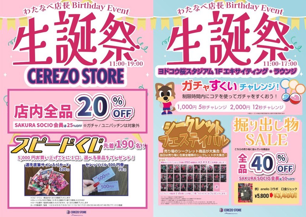 日頃の「CEREZO STORE」へのご愛顧に感謝いたしまして、11/2(日)にCEREZO STOREスペシャルイベント「わたなべ店長生誕祭」を開催いたします!ファン・サポーターの皆さまにお楽しみいただけるイベントを多数ご用意!ご来店をお待ちしております。