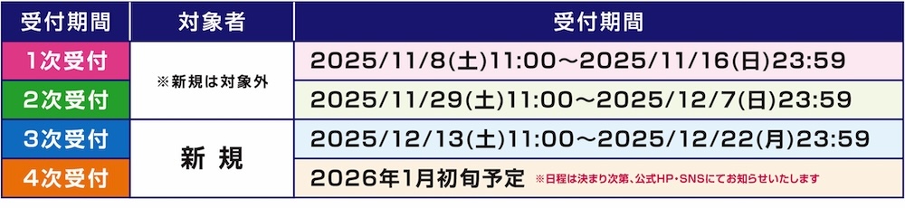※1次・2次受付は継続でのシーズンシート購入受付のみとなります