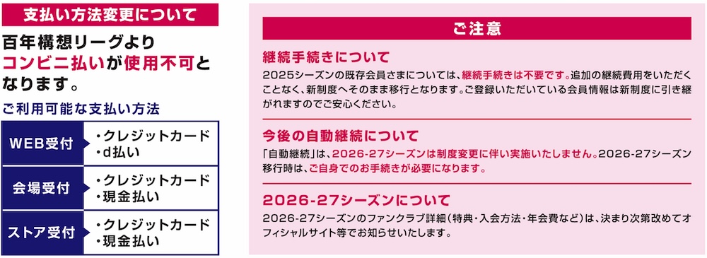 明治安田J1百年構想リーグへの自動継続につきましてはすべての方が無料継続となります。明治安田J1百年構想リーグ終了後の2026-2027シーズンへの自動継続につきましては、特典や制度変更に伴いまして中止とさせていただきます。