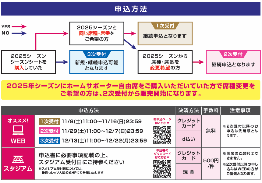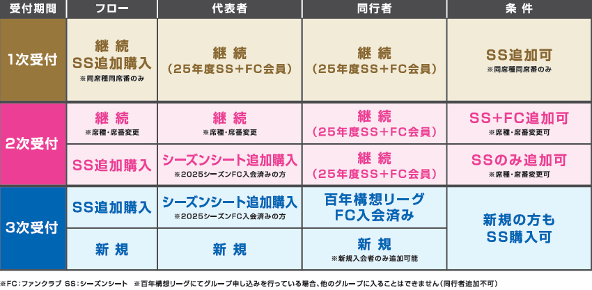 2025シーズンのシーズンシートをご購入されており、明治安田J1百年構想リーグも同席種・同席番でご購入を希望される皆さまは1次受付の期間中にお申し込みください。受付はWEB受付、もしくは電話受付での対応を行なっておりますのでご利用ください。