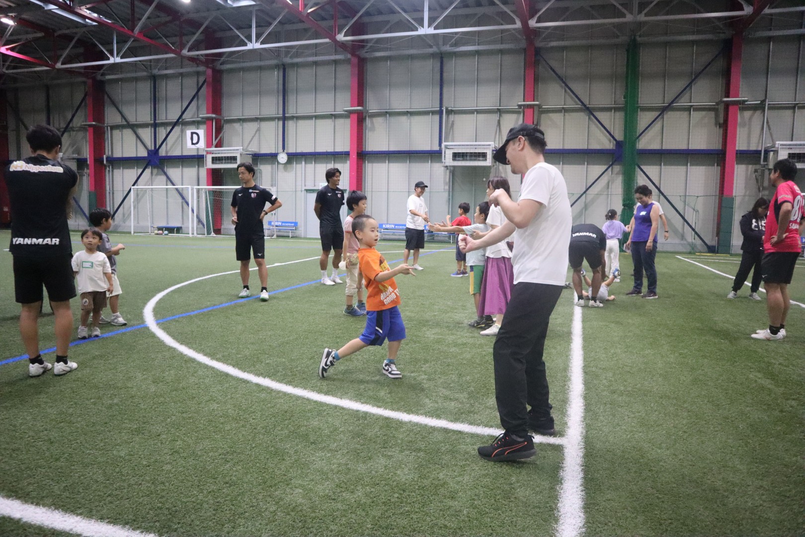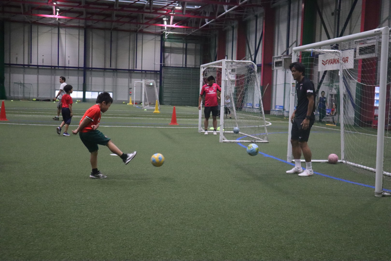 お子様と保護者が1対1で対戦するゲームは、大いに盛り上がりました。続いて行ったゴールへのシュート練習では、コーチやアンバサダーも驚くほど強く、また巧みなシュートを放つ子どもたちの姿がたくさん見られました。