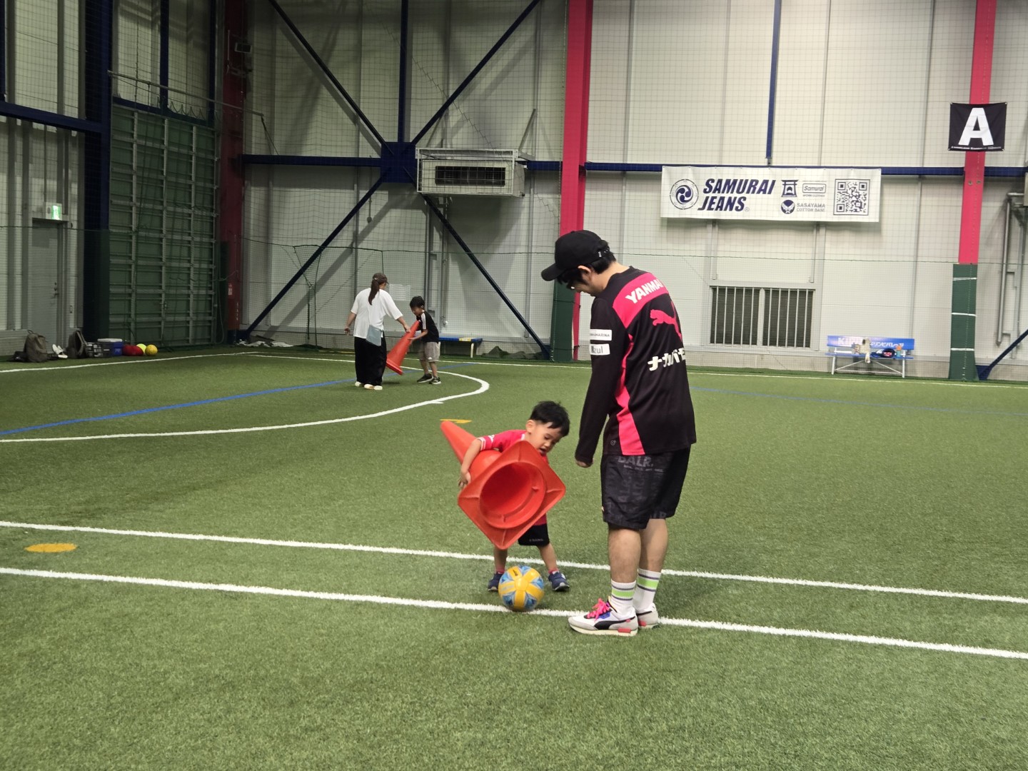 1つのメニューを達成するごとにアンバサダーからスタンプがもらえます。合計4つのスタンプを集めるために、参加者の皆さんは一生懸命に取り組まれていました。親子ペアでさまざまな対戦に挑戦しました。「コーンでボールを捕まえよう!」では、どちらがより多くボールを捕まえられるかを競い、自分の身長よりも大きなコーンを抱えながら真剣な表情で取り組む姿が見られました。