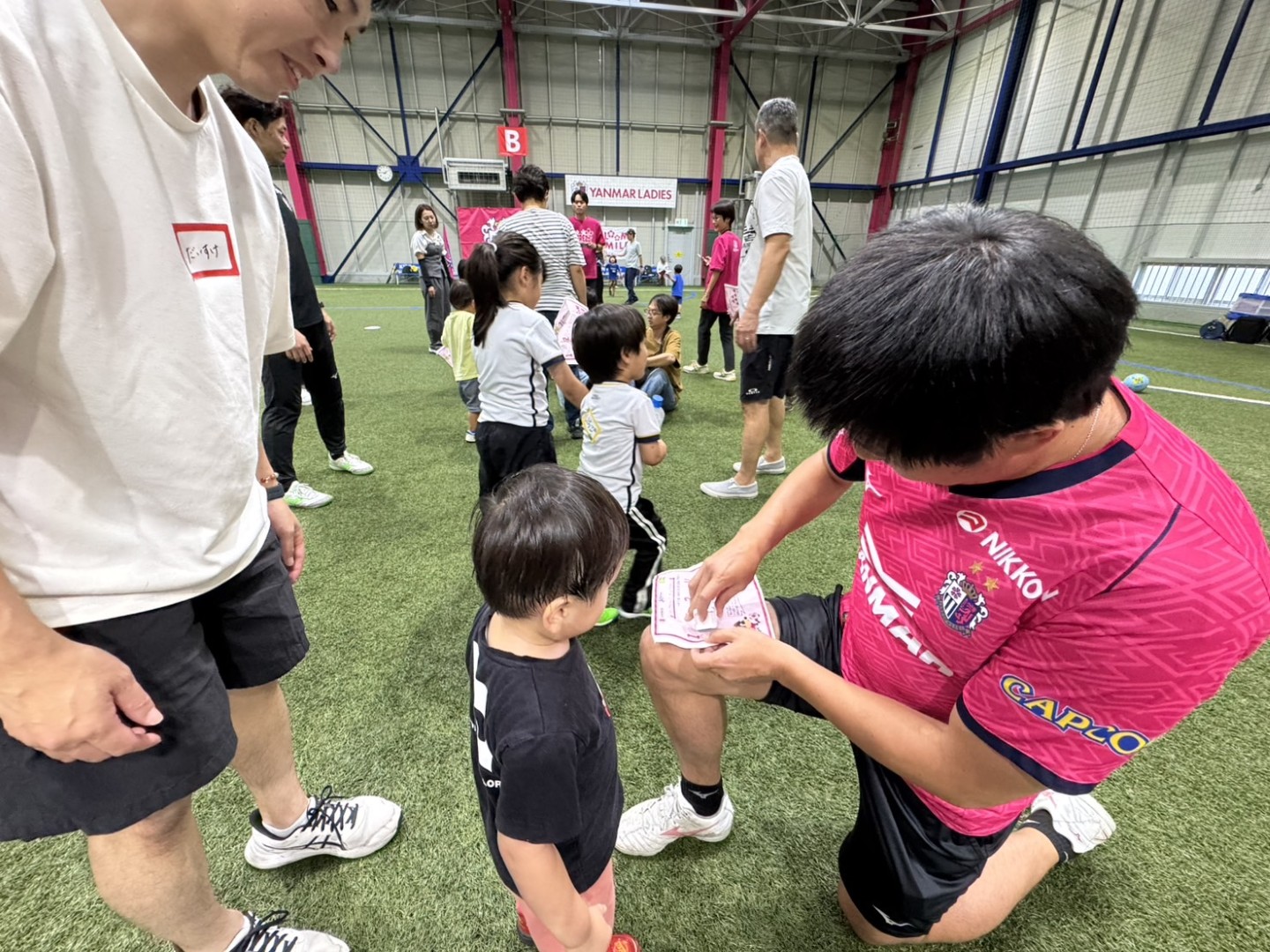 あいにくの悪天候となりましたが、全天候型のセレッソフットサルパークを活用したため、影響はなく、参加者の皆さんは思い切り身体を動かして楽しんでいただきました。親子ペアでのウォーミングアップでは、人工芝の上で思い切り寝転がる場面もありました。さらに、勝矢寿延アンバサダーや酒本憲幸アンバサダー、コーチたちと一緒に行ったアイスブレイクの鬼ごっこや足を使ったじゃんけんでは、参加者の笑顔や歓声が会場いっぱいに広がりました。