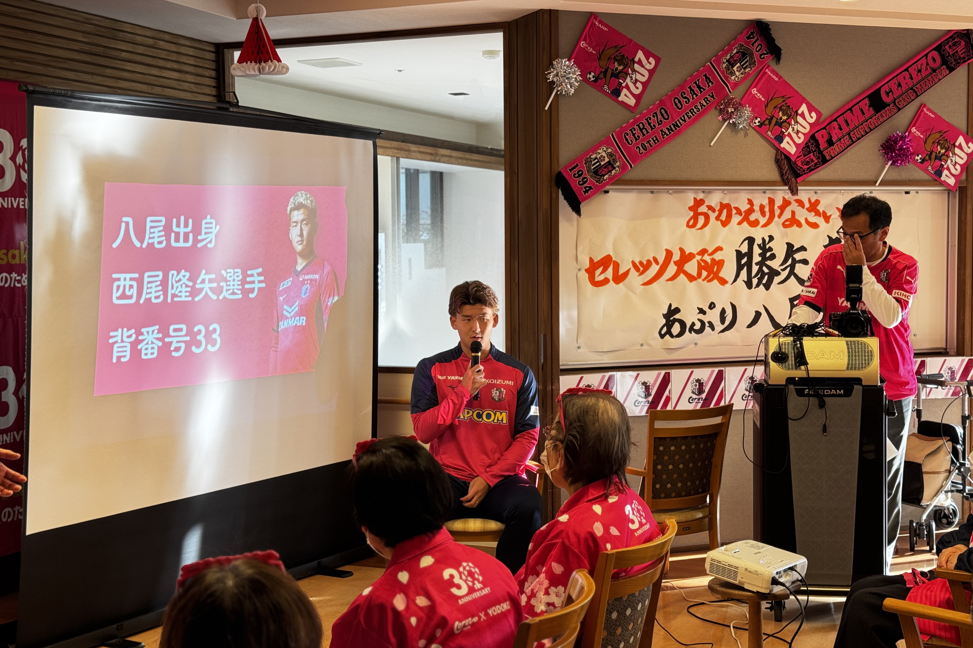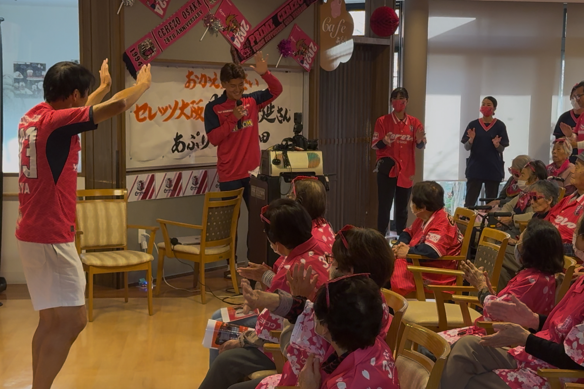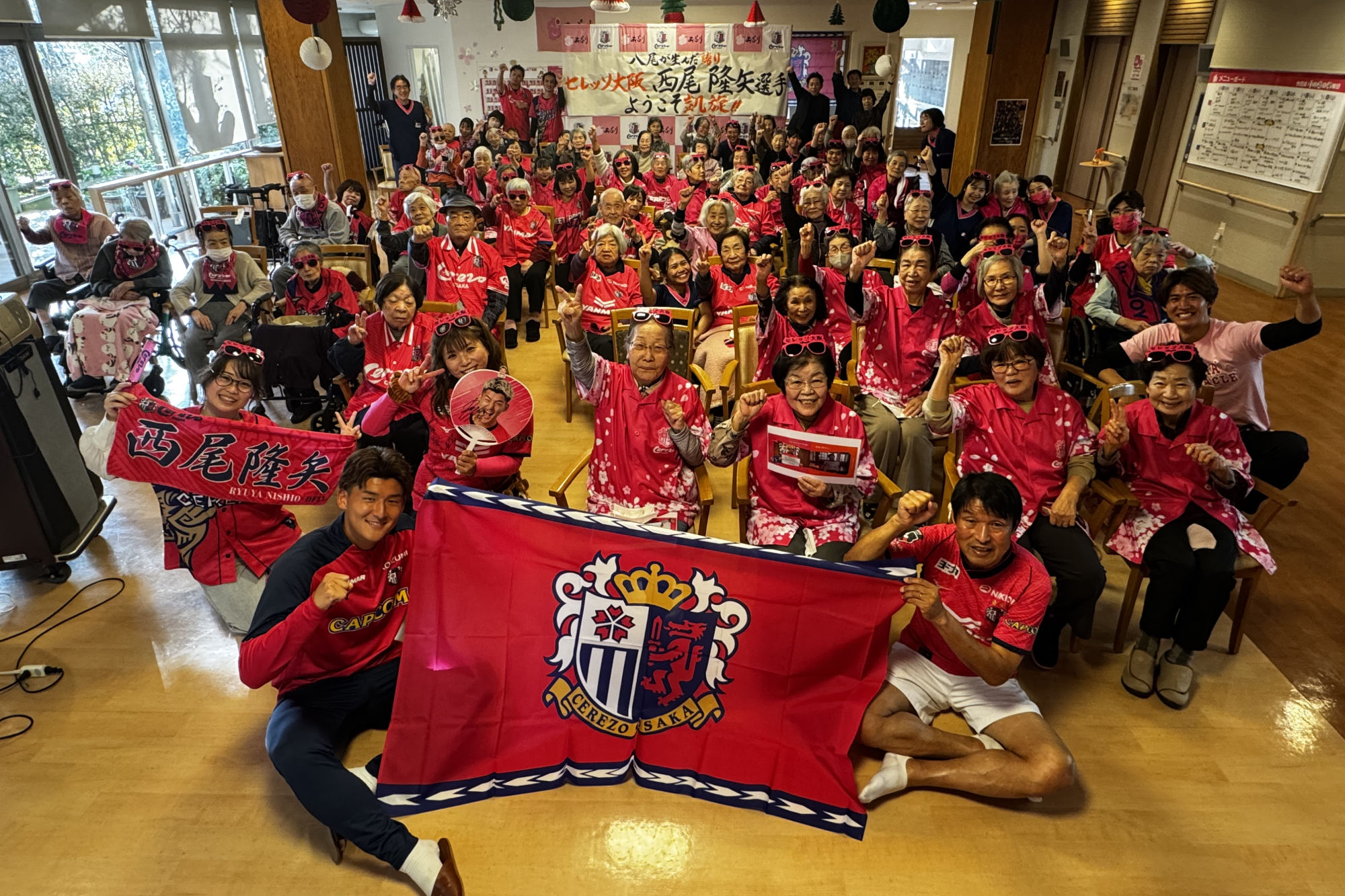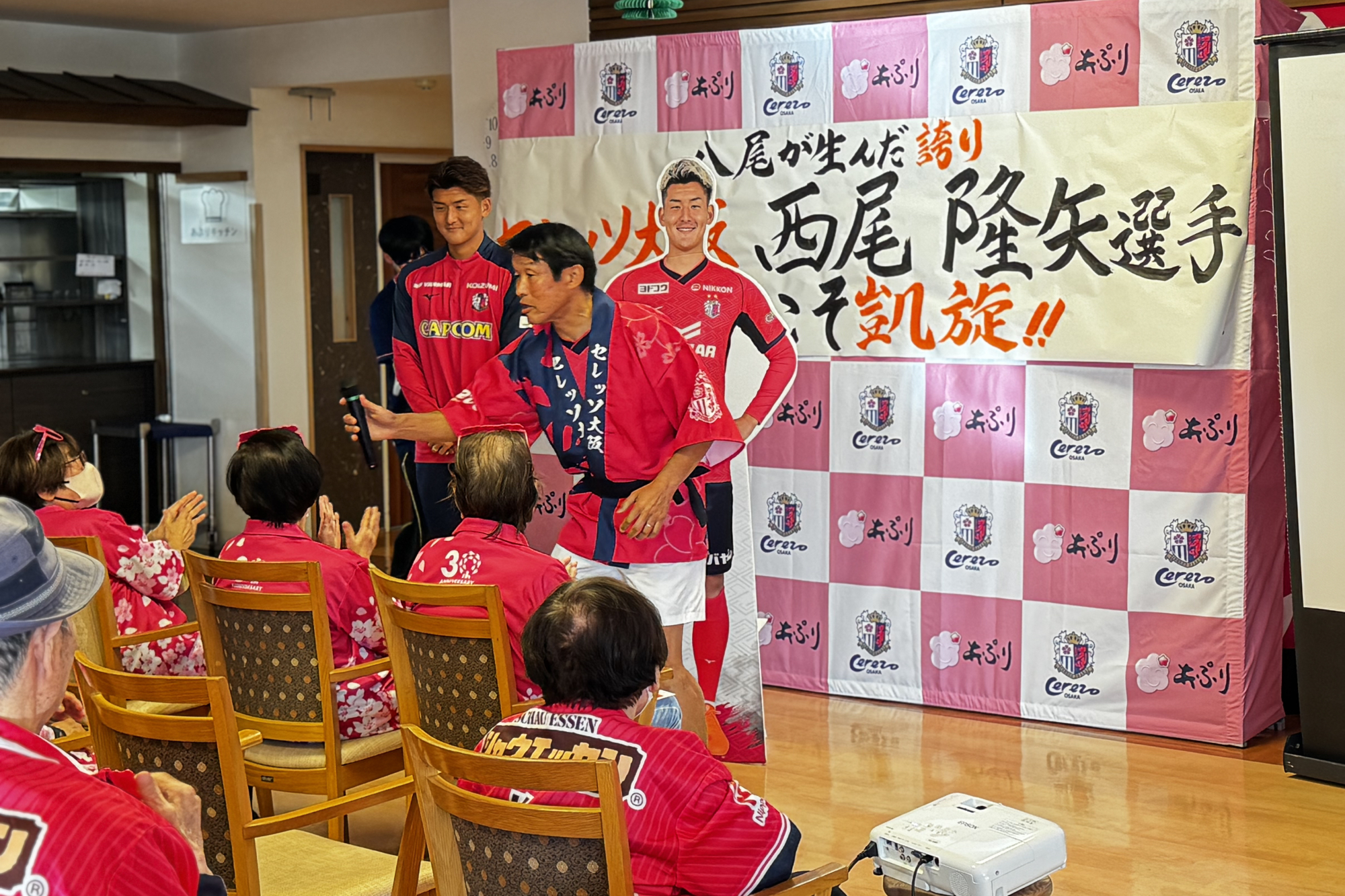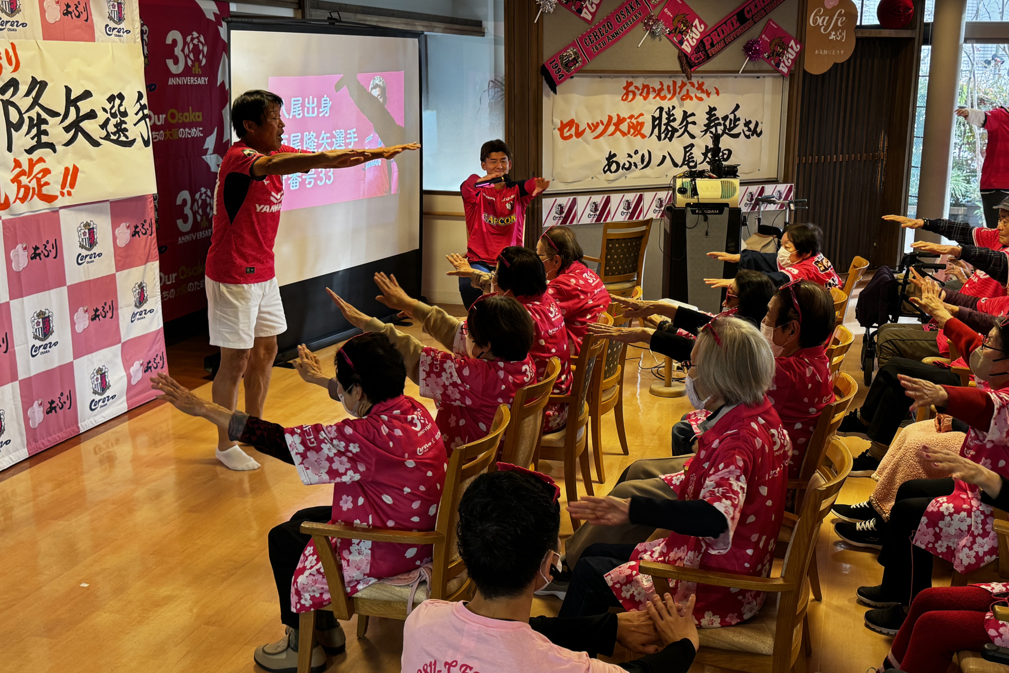 11/28(金)、高齢者施設 あぷり八尾太田に、西尾 隆矢選手と勝矢寿延アンバサダーが訪問しました。こちらは、サントリーウエルネスが展開する地域参加型プロジェクト「Be supporters!(ビー サポーターズ)」の一環として、株式会社あぷりの同施設を訪問し、施設利用者の方と交流したものです。あぷりスタッフの方による呼び込みで、勝矢アンバサダーが登場すると、会場は大盛り上がり。その後、自身のキャリアについて説明を挟み、特別ゲストとして「八尾市出身 西尾 隆矢選手」と前置き、西尾選手のパネルをゲストとして呼び込みました。利用者の皆さまが「なんだ、パネルか!」と笑っている中、会場後方からこっそり西尾選手が"ご本人登場"的にサプライズ登場。会場は驚きとともに大きな拍手に包まれました。利用者の方々からは「金髪じゃない!」、「写真よりかっこいい!」と歓迎ムードで温かい雰囲気でした。西尾選手の紹介を挟んだ後、利用者の皆さまと一緒に着座でできる水泳ポーズ体操(クロール・平泳ぎ・バタフライ)を行い、身体を動かしました。その後は合唱のプログラムに移り、「ふるさと」、「紅葉」を全員で歌唱。終了に向かう流れの中で、「西尾選手の十八番が聴きたい」との急遽リクエストがあり、西尾選手が「試合より緊張する!」と言いながら長渕剛さんの『とんぼ』を顔を赤くしながら歌いました。最後は、全員でセレッソの手拍子を実施し、会場一体となって締めくくりました。その後、利用者の方々との写真撮影やサイン会を行い、盛況のうちに終了しました。