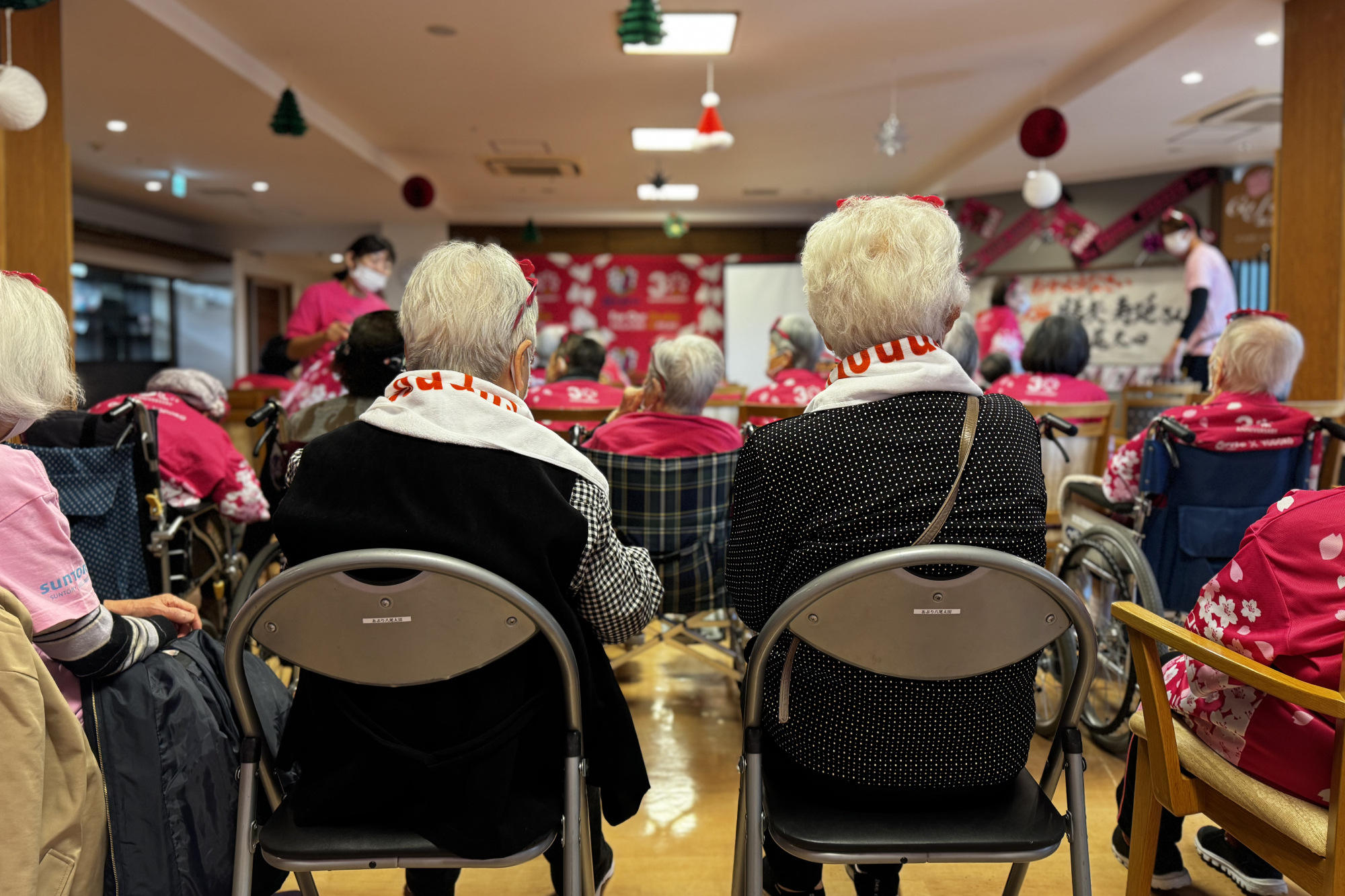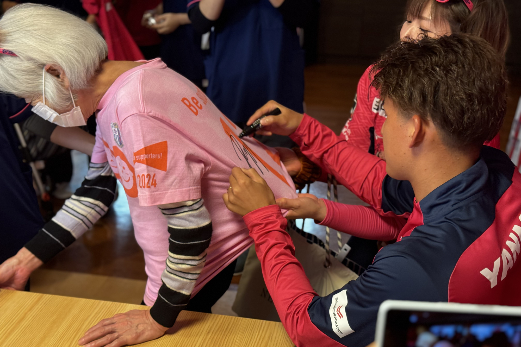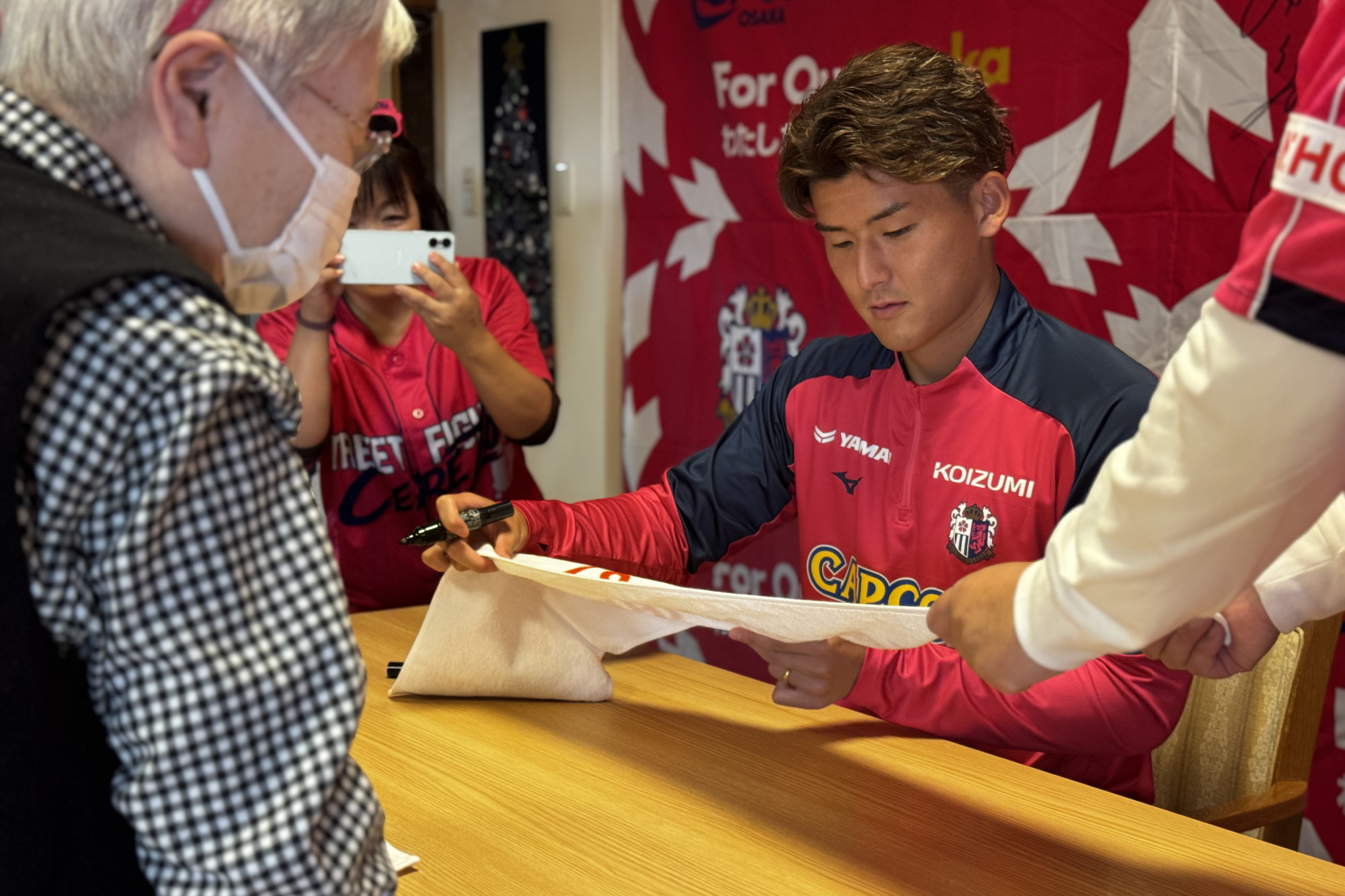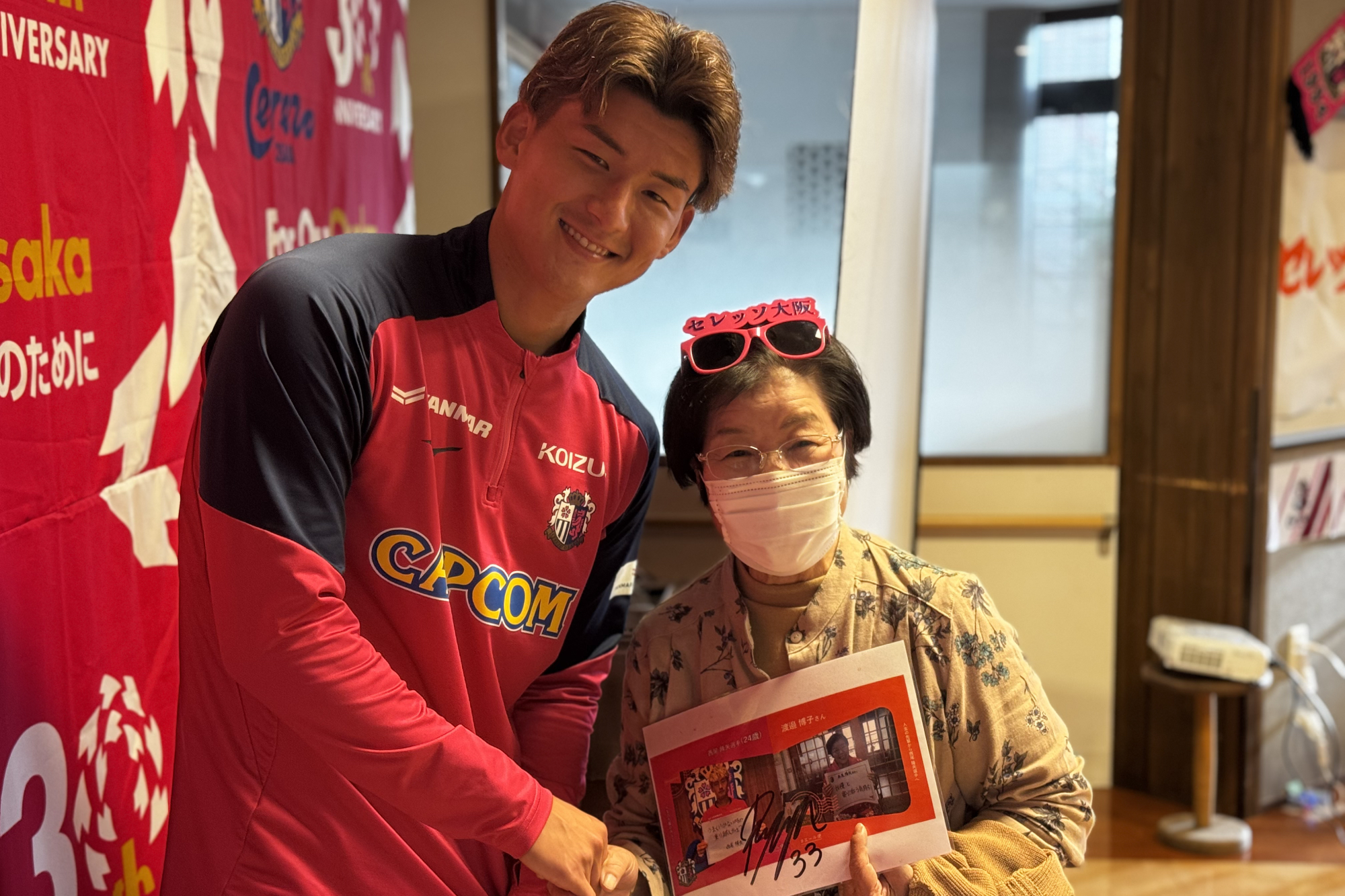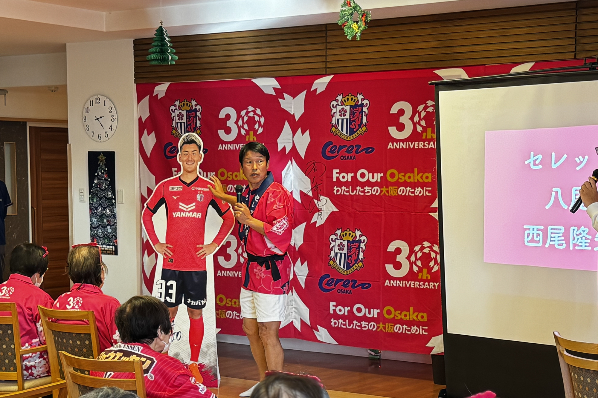 11/28(金)、高齢者施設 あぷり八尾太田に、西尾 隆矢選手と勝矢寿延アンバサダーが訪問しました。こちらは、サントリーウエルネスが展開する地域参加型プロジェクト「Be supporters!(ビー サポーターズ)」の一環として、株式会社あぷりの同施設を訪問し、施設利用者の方と交流したものです。あぷりスタッフの方による呼び込みで、勝矢アンバサダーが登場すると、会場は大盛り上がり。その後、自身のキャリアについて説明を挟み、特別ゲストとして「八尾市出身 西尾 隆矢選手」と前置き、西尾選手のパネルをゲストとして呼び込みました。利用者の皆さまが「なんだ、パネルか!」と笑っている中、会場後方からこっそり西尾選手が"ご本人登場"的にサプライズ登場。会場は驚きとともに大きな拍手に包まれました。利用者の方々からは「金髪じゃない!」、「写真よりかっこいい!」と歓迎ムードで温かい雰囲気でした。西尾選手の紹介を挟んだ後、利用者の皆さまと一緒に着座でできる水泳ポーズ体操(クロール・平泳ぎ・バタフライ)を行い、身体を動かしました。その後は合唱のプログラムに移り、「ふるさと」、「紅葉」を全員で歌唱。終了に向かう流れの中で、「西尾選手の十八番が聴きたい」との急遽リクエストがあり、西尾選手が「試合より緊張する!」と言いながら長渕剛さんの『とんぼ』を顔を赤くしながら歌いました。最後は、全員でセレッソの手拍子を実施し、会場一体となって締めくくりました。その後、利用者の方々との写真撮影やサイン会を行い、盛況のうちに終了しました。