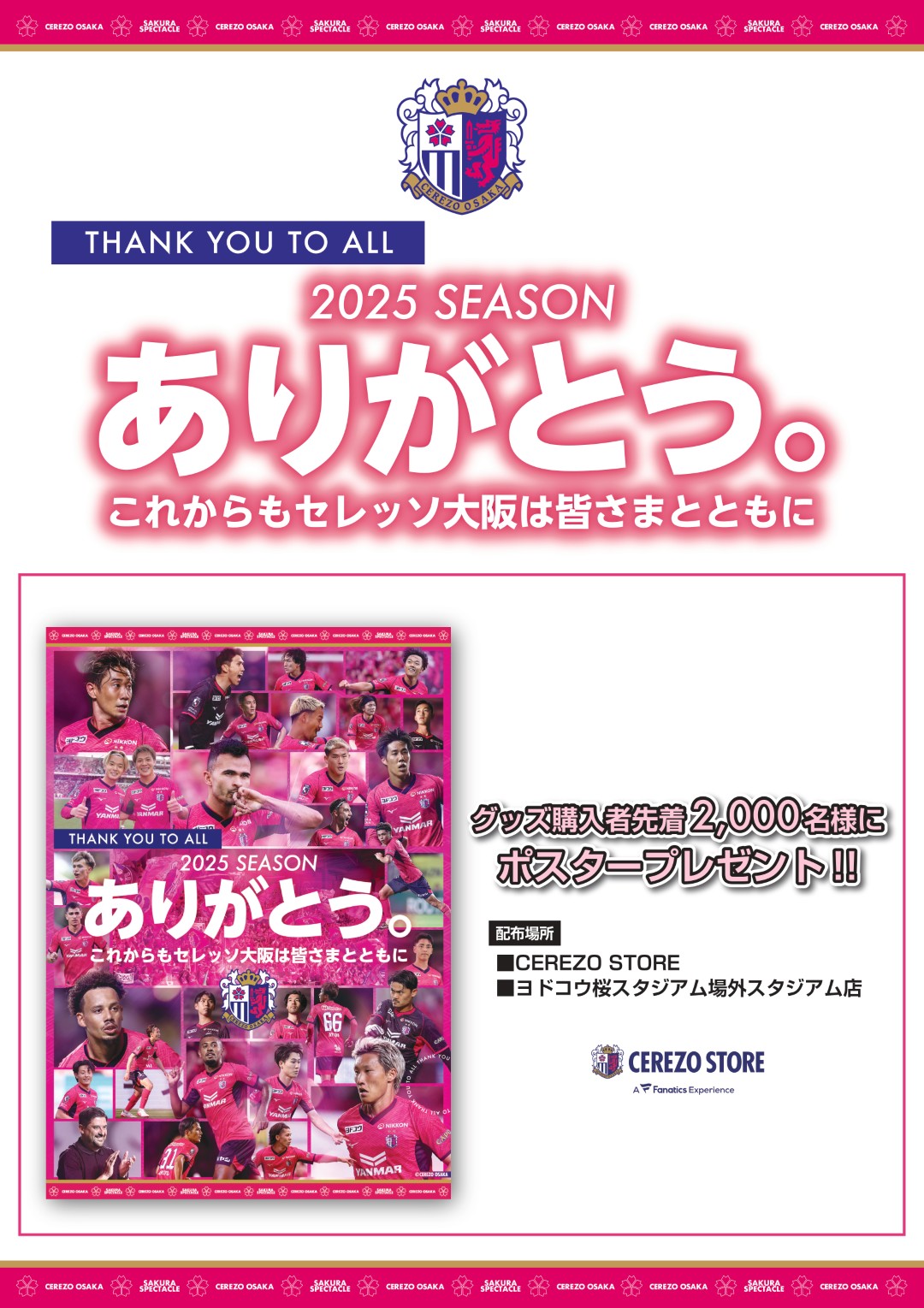 12/6(土)横浜FC戦は、今シーズンの御礼の気持ちを込めて、「応援感謝セール」を開催!レプリカユニフォームが30%OFFのほか、人気商品もお得なお値段で販売いたします。また、グッズをご購入いただいた方へ毎年好評の「ありがとうポスター」をプレゼント!最終戦もぜひお得で楽しいグッズストアへお立ち寄りください!