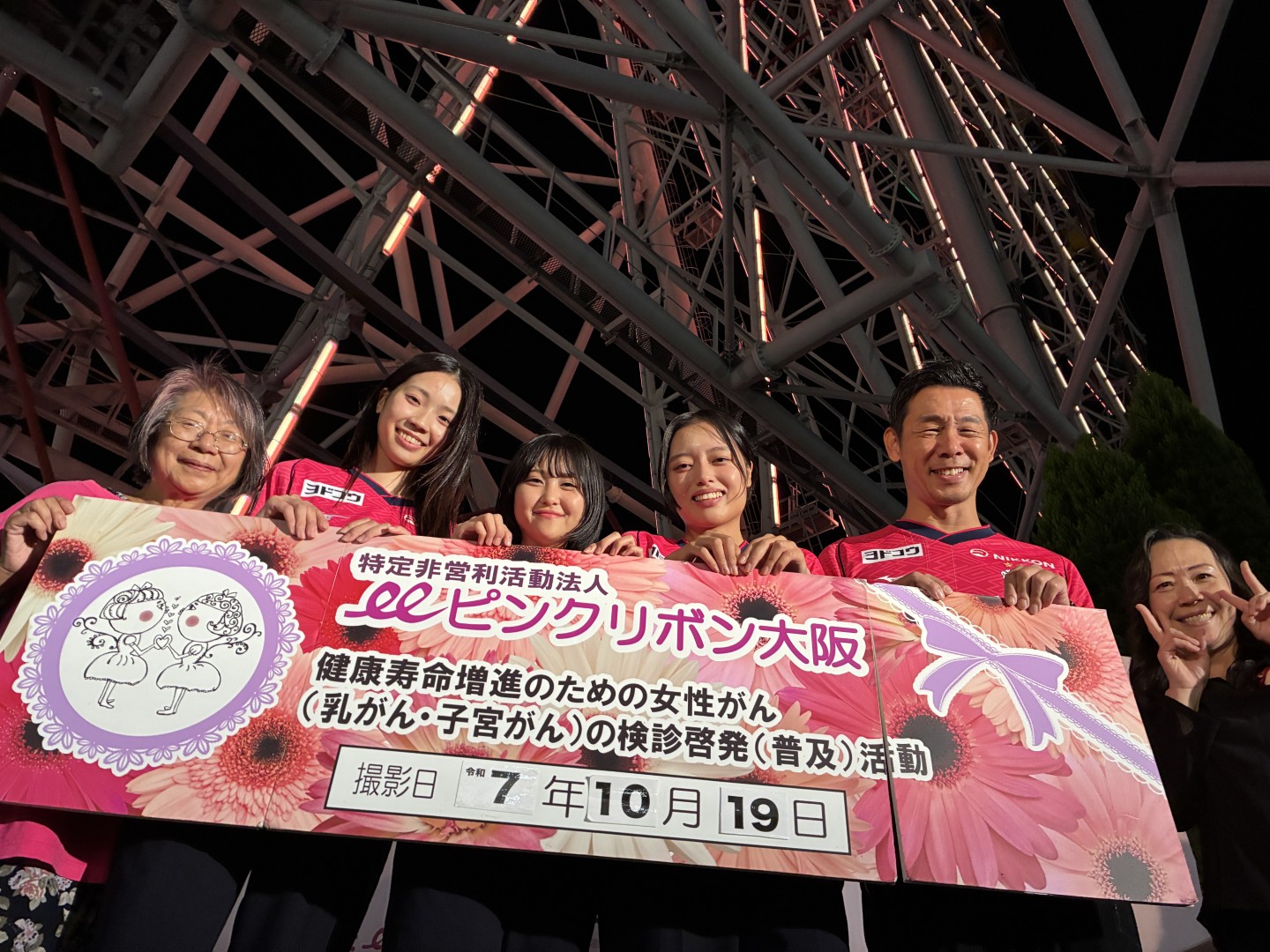 10月のピンクリボン月間に合わせ、乳がんの早期発見・早期診断・早期治療の大切さを伝えるこのイベント。 ステージで行われたパネルディスカッションでは、「男性も乳がんに!! AYA世代は!?」をテーマに、西川さんと応援ナビゲーターがパネラーとして登壇しました。 若年性乳がんや男性乳がんについての理解を深めるとともに、自分自身や大切な人を守るため、検診受診の重要性を会場の皆様と一緒に考え、呼びかけました。イベントのフィナーレには、大観覧車「りんくうの星」のライトアップ点灯式に参加。カウントダウンとともに観覧車が鮮やかなピンク色に染まり、夜空に乳がん検診啓発のメッセージを灯しました。