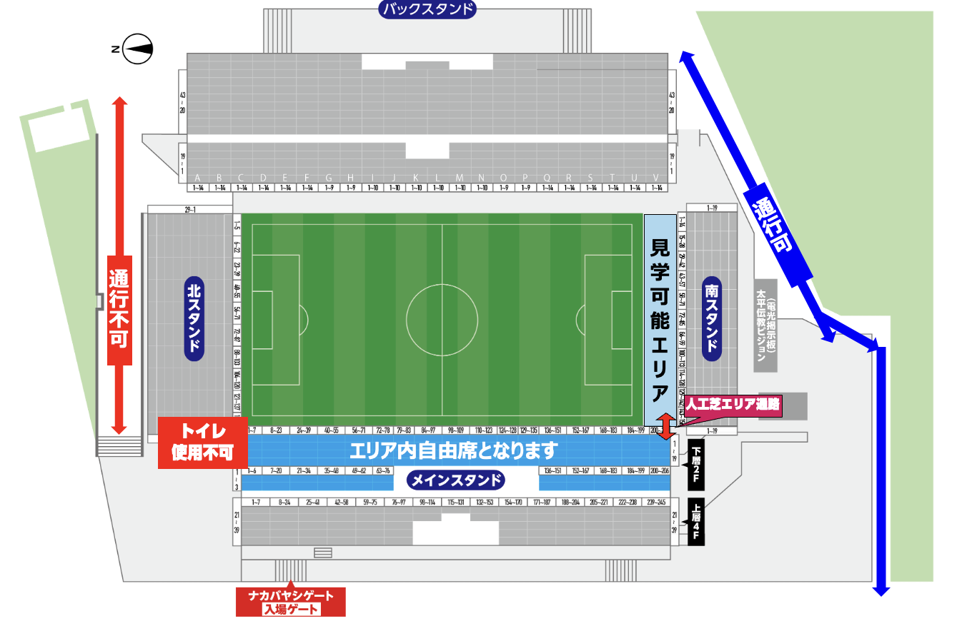 当日はメインスタンド2F部分、人工芝エリアを解放いたします。エリア内自由席となっております。