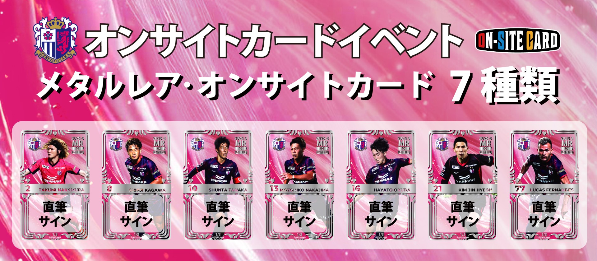 人気グッズのオンサイトカードの2025シーズンデザイン第3弾を発売いたします。ご自身のお手持ちの画像を、世界に1枚だけのカードにできる「オンサイトカード」。表面にはランダムで選手の写真が掲載され、裏面にはご自身のスマホの画像やオフィシャル・エンブレムをプリントできるサービスです。運がよければ選手の直筆サイン入りカードやシークレットカードが当たるかも!? ぜひお楽しみください!