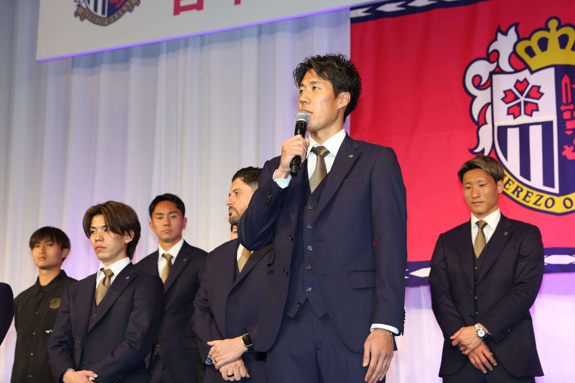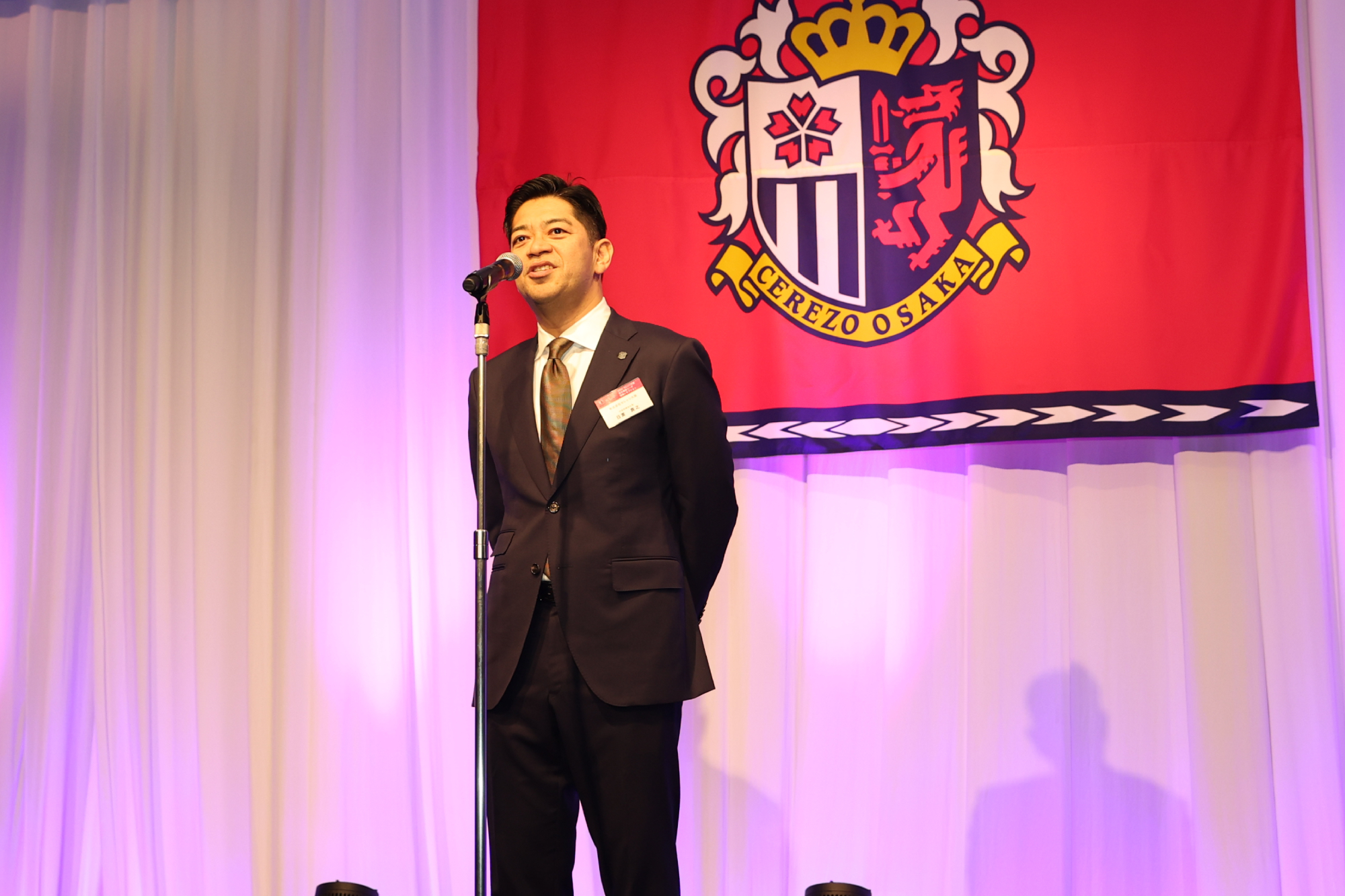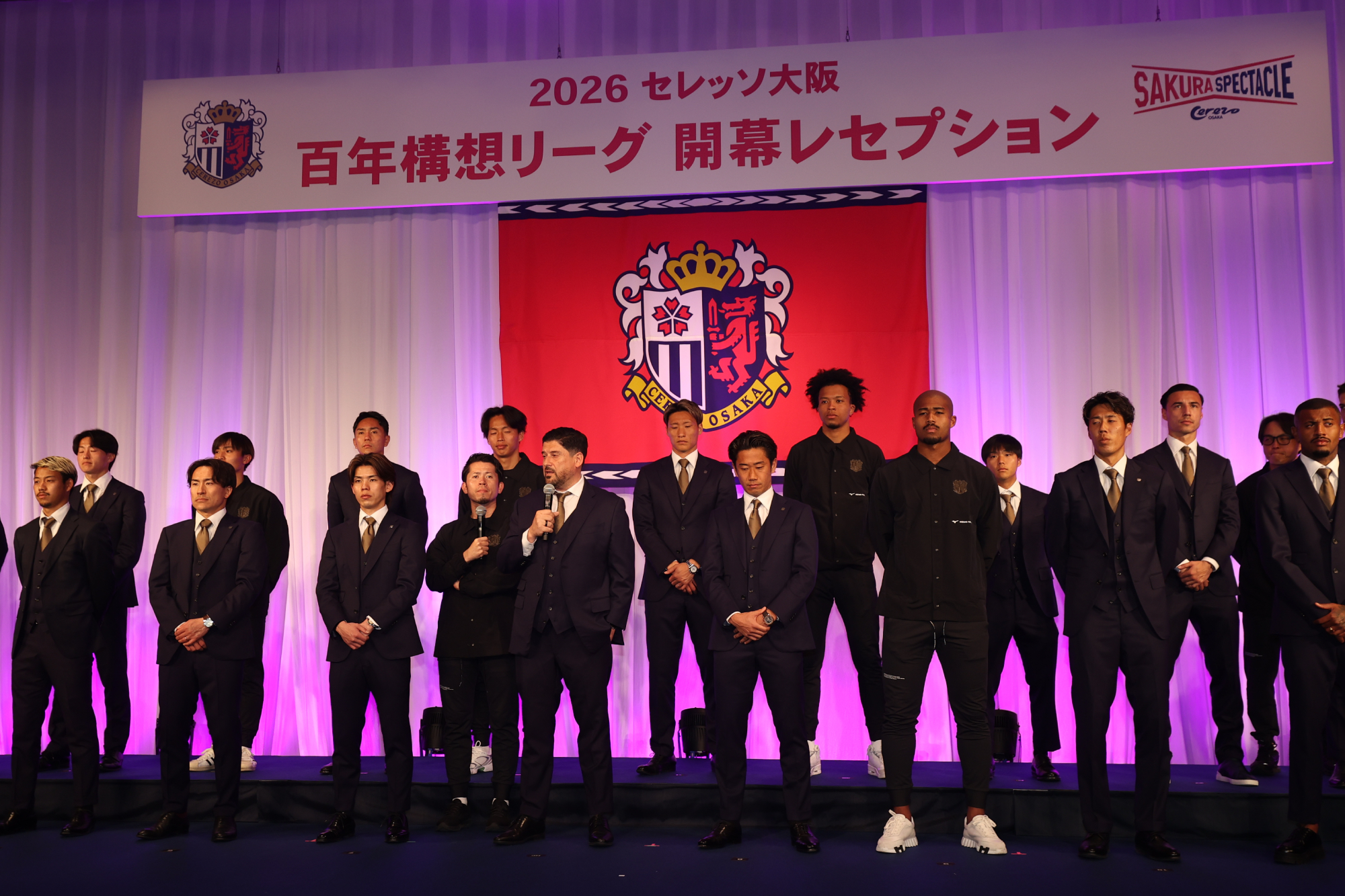 1/15(木)、スイスホテル南海大阪にて2026セレッソ大阪 百年構想リーグ開幕レセプションを開催しました。当日は、パートナー企業、出資企業、ホームタウン関係先の皆さまなどをご招待し、約330名の方々にご出席いただきました。冒頭、主催者を代表して代表取締役社長 日置貴之が登壇し、日頃よりクラブを支えてくださっている皆さまへ感謝の言葉を述べました。また、百年構想リーグという特別なシーズンに向け、「原点回帰」と「新たなチャレンジ」を軸に、アカデミーの徹底強化とトップチームの競争力向上を両輪として、セレッソ大阪を大阪に根付く文化として育てていきたいという決意を語りました。ご来賓のご挨拶では、ホームタウンである大阪市および堺市より、大阪市・山本剛史副市長、堺市・本屋和宏副市長にご登壇いただき、激励のお言葉を頂戴しました。続いて、今シーズンよりプラチナパートナーとしてセレッソファミリーに加わっていただくエレコム株式会社 代表取締役会長 葉田 順治様より、スタジアムで体感した熱気やセレッソ大阪とのご縁に触れながら、クラブの優勝とご参加の皆さまの発展を祈念した乾杯のご発声をいただきました。乾杯後は、西川スタジアムDJのアナウンスとともに、監督・選手が壇上に登場。チームを代表して、アーサー・パパス監督、田中駿汰選手が皆さまへご挨拶を行いました。その後、選手たちは各テーブルを回り、ゲストの皆さまへのご挨拶や写真撮影などで交流を深めました。