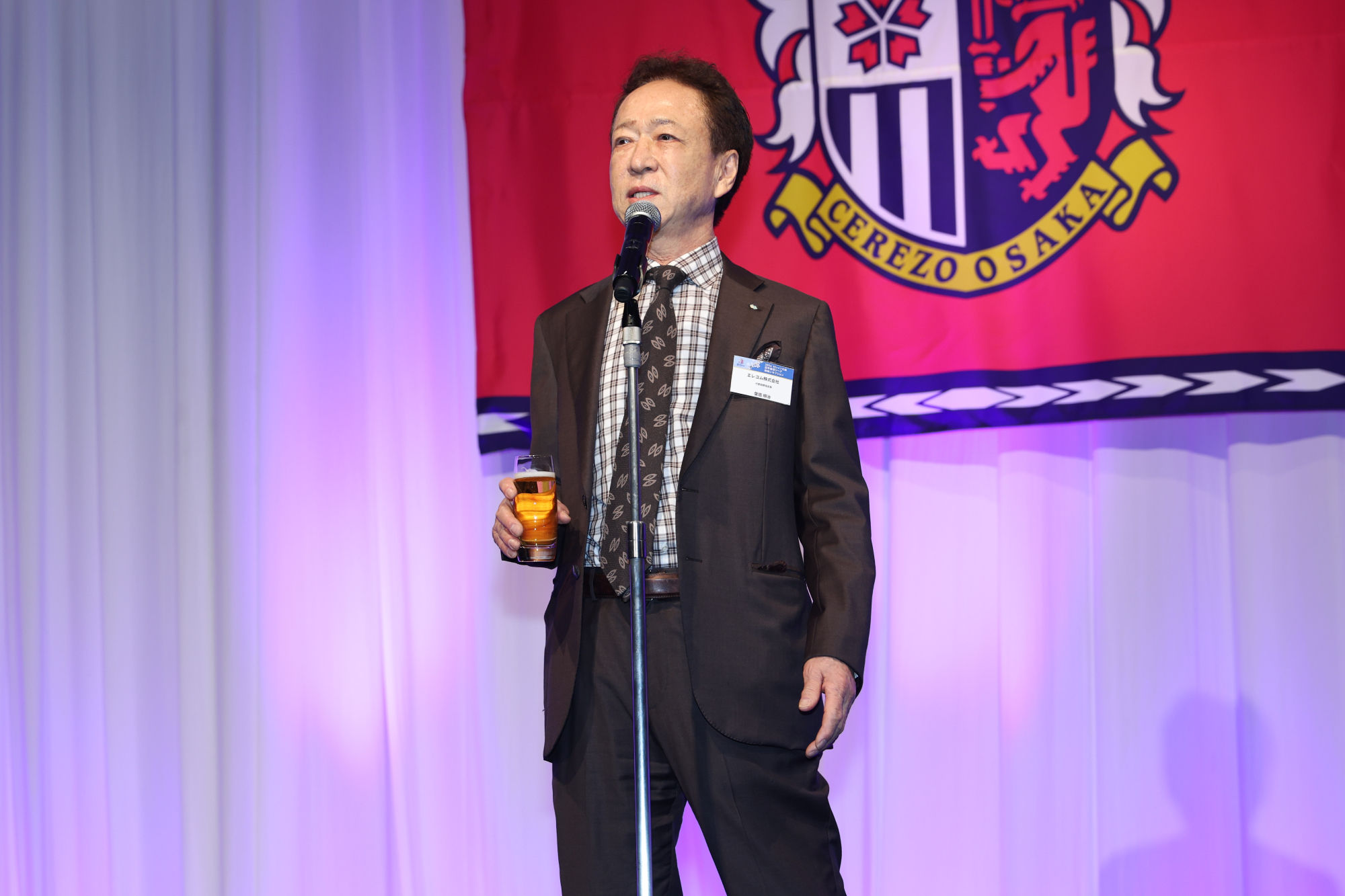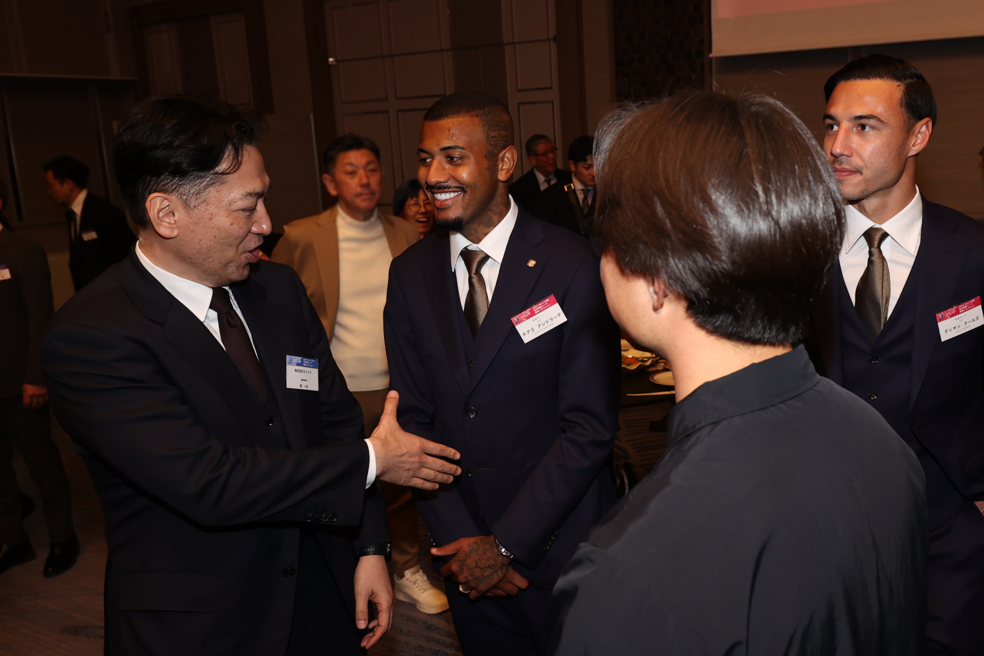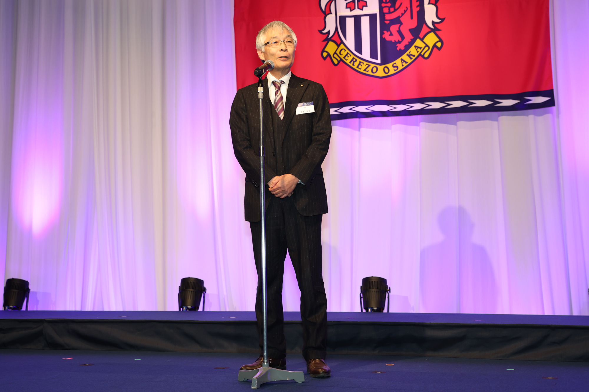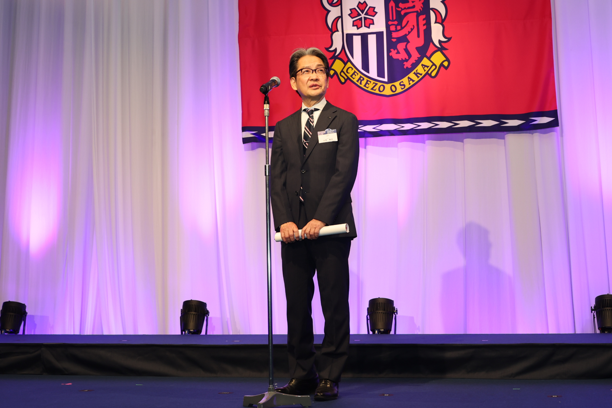 1/15(木)、スイスホテル南海大阪にて2026セレッソ大阪 百年構想リーグ開幕レセプションを開催しました。当日は、パートナー企業、出資企業、ホームタウン関係先の皆さまなどをご招待し、約330名の方々にご出席いただきました。冒頭、主催者を代表して代表取締役社長 日置貴之が登壇し、日頃よりクラブを支えてくださっている皆さまへ感謝の言葉を述べました。また、百年構想リーグという特別なシーズンに向け、「原点回帰」と「新たなチャレンジ」を軸に、アカデミーの徹底強化とトップチームの競争力向上を両輪として、セレッソ大阪を大阪に根付く文化として育てていきたいという決意を語りました。ご来賓のご挨拶では、ホームタウンである大阪市および堺市より、大阪市・山本剛史副市長、堺市・本屋和宏副市長にご登壇いただき、激励のお言葉を頂戴しました。続いて、今シーズンよりプラチナパートナーとしてセレッソファミリーに加わっていただくエレコム株式会社 代表取締役会長 葉田 順治様より、スタジアムで体感した熱気やセレッソ大阪とのご縁に触れながら、クラブの優勝とご参加の皆さまの発展を祈念した乾杯のご発声をいただきました。乾杯後は、西川スタジアムDJのアナウンスとともに、監督・選手が壇上に登場。チームを代表して、アーサー・パパス監督、田中駿汰選手が皆さまへご挨拶を行いました。その後、選手たちは各テーブルを回り、ゲストの皆さまへのご挨拶や写真撮影などで交流を深めました。