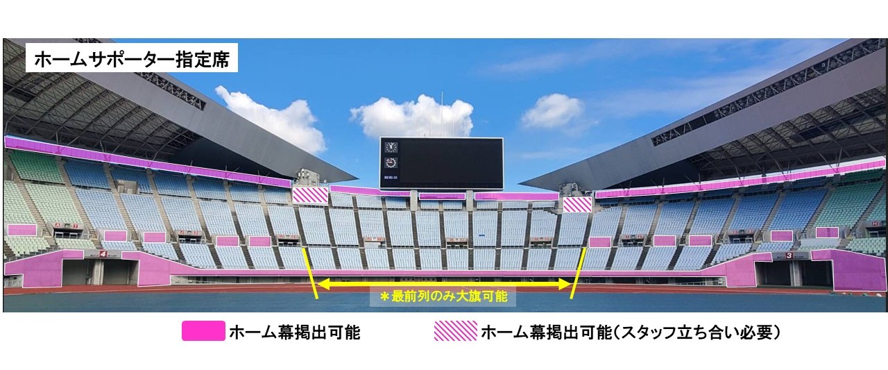 ・ホームサポーター席は全席立ち見可能エリアとなります。ただし、立ち見を強制するものではございません。当該エリアにおいては立ち見の方、旗、ゲートフラッグ等で視界が遮られる可能性があります。着席での観戦を希望されるお客様はゴール裏スタンド以外の座席エリアでの観戦を推奨いたします。
