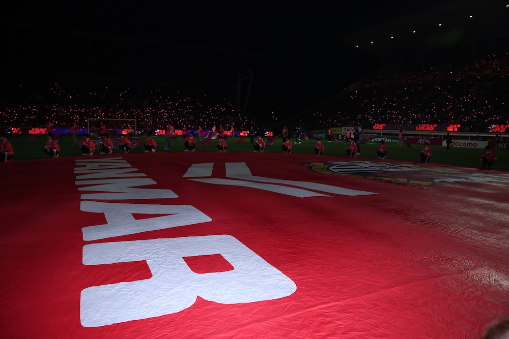 試合開始前にピッチ上で大型のセンターフラッグを掲げていただきます