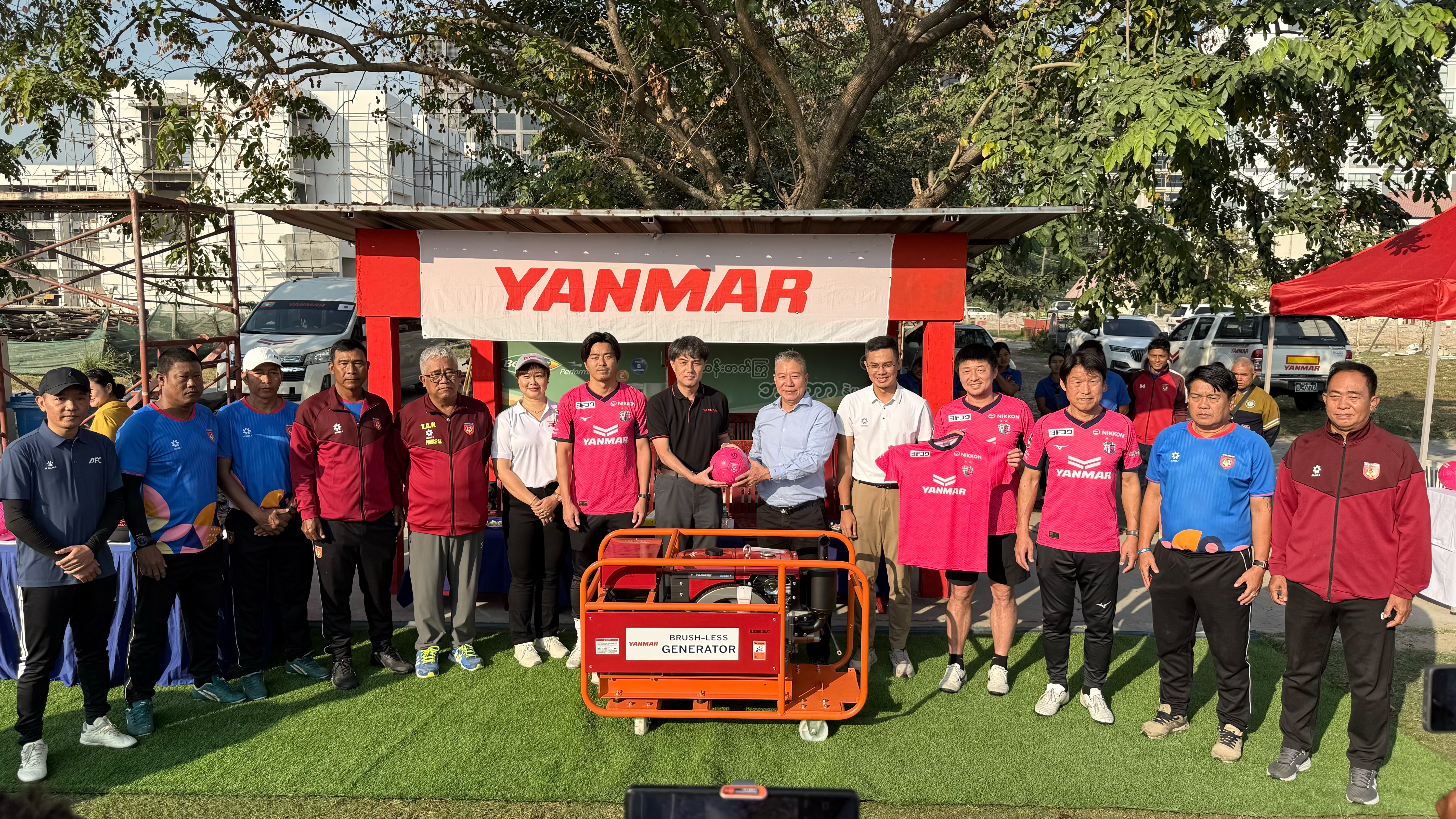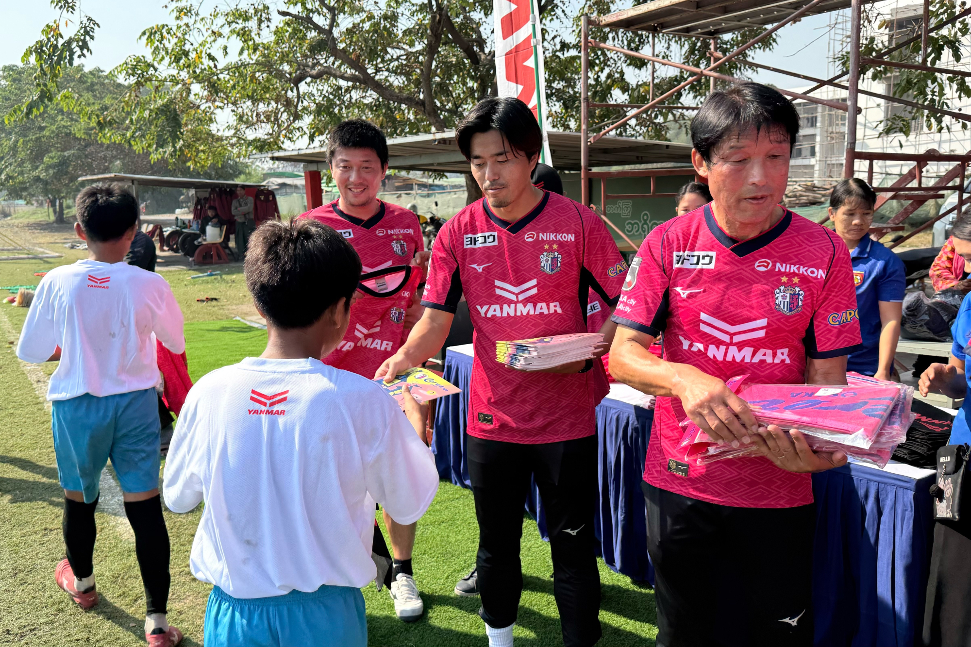 クリニック終了後、現地の皆さまへセレッソ大阪のアイテムを寄贈いたしました。これらのアイテムは、チャリティーオークションによる収益をもとに用意させていただいたもので、オークションを通じて皆さまから寄せられた想いが、サッカーボールやコンフィットシャツという形となり、ミャンマーの子どもたちの手に届きました。また、ご協力いただいた両団体の皆さまにもユニフォームを贈呈し、今後の継続的な連携に向けて親交を深める機会となりました。今回の訪問を通じて、「言葉の壁を越えて人と人をつなぐスポーツの力」を改めて実感しております。オークションにご参加いただいた皆さまに、心より感謝申し上げます。セレッソ大阪は今後も、サッカーを通じた国際交流に積極的に取り組んでまいります。