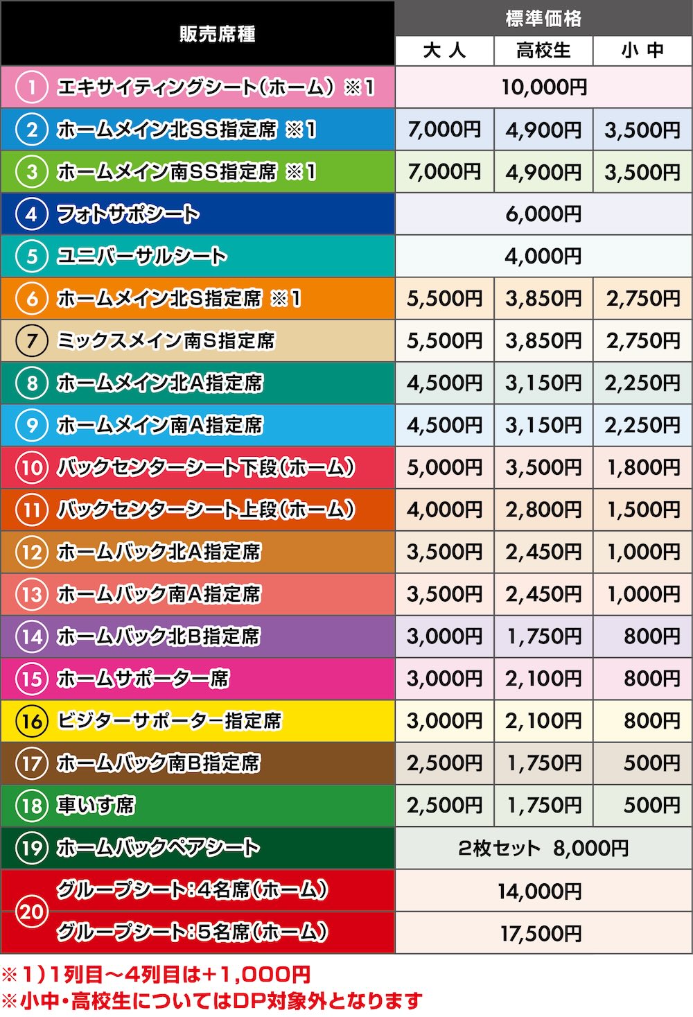※ビジターチームの応援をされる場合は、⑦ミックスメイン南S指定席、⑯ビジターサポーター指定席をお求めください