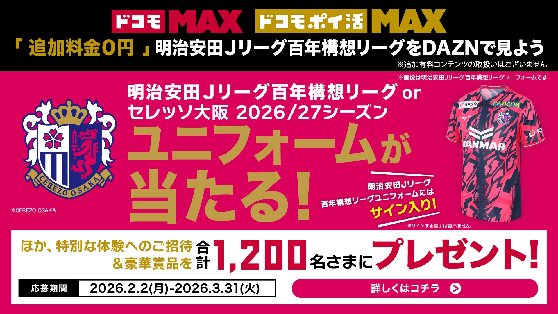 セレッソ大阪は、株式会社NTTドコモとの協業により、「ドコモ MAX」「ドコモ ポイ活 MAX」ご契約者様を対象としたキャンペーンを、以下の通り実施いたします。スタジアムツアーや全クラブユニフォームに加えて、セレッソ大阪からはサイン入りユニフォーム(26特別シーズン)をプレゼントいたします。