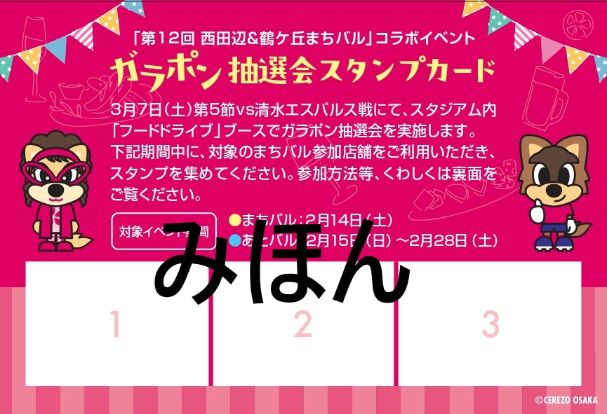 2月7日(土)のホームゲームで配布された「西田辺&鶴ケ丘まちバル」スタンプ台紙をお持ちの方で、まちバル参加店舗にてスタンプを1つ以上押印している場合、抽選会にご参加いただけます。