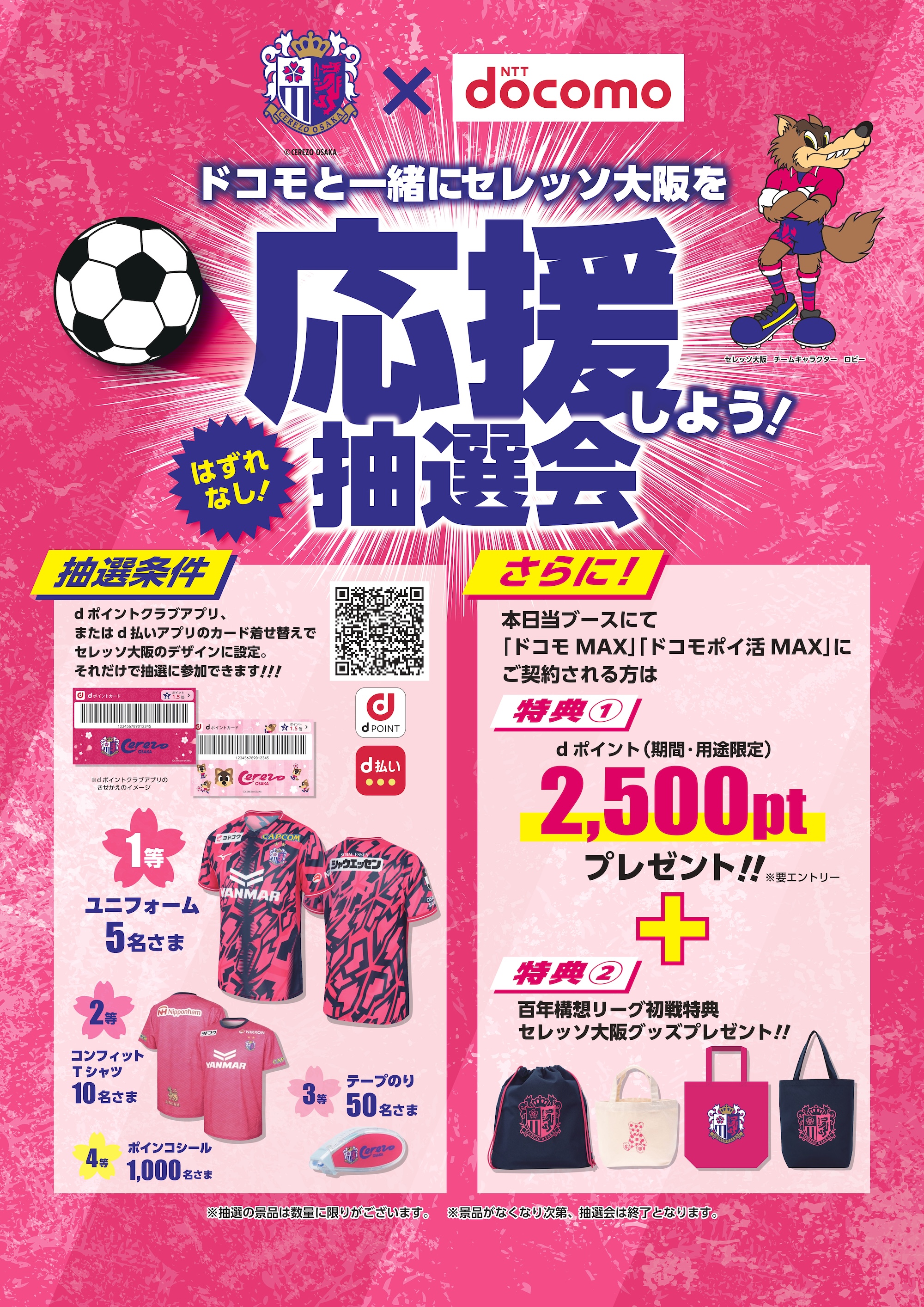 ブースにて「ドコモMAX」「ドコモポイ活MAX」にご契約いただいた方へ、dポイント(期間・用途限定)+セレッソ大阪グッズをプレゼントします!ドコモMAX・ドコモポイ活MAXを通じて、セレッソ大阪を応援しましょう!