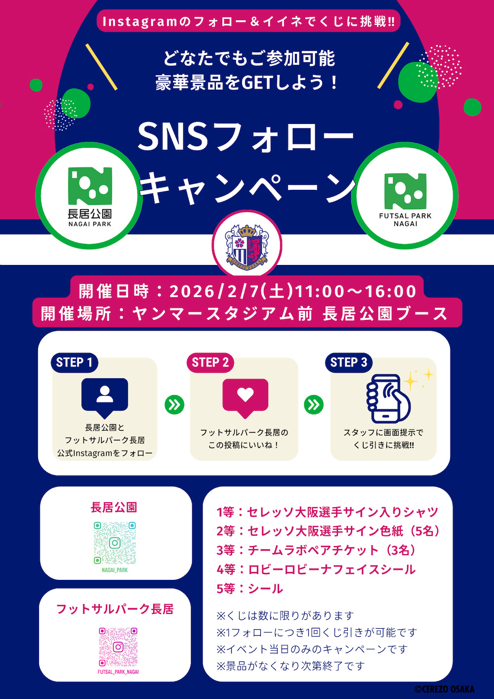 2/7(土)G大阪戦当日は、長居公園では「セレッソ大阪応援デー」を実施します!キャンペーン内容の詳細は下記内容をご確認ください!