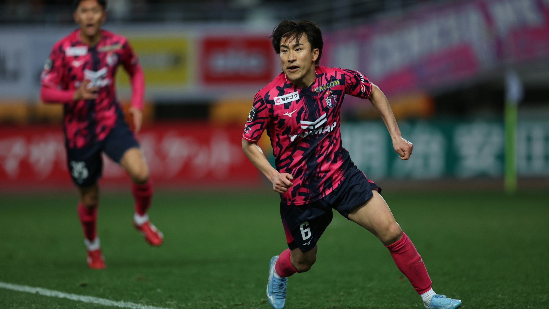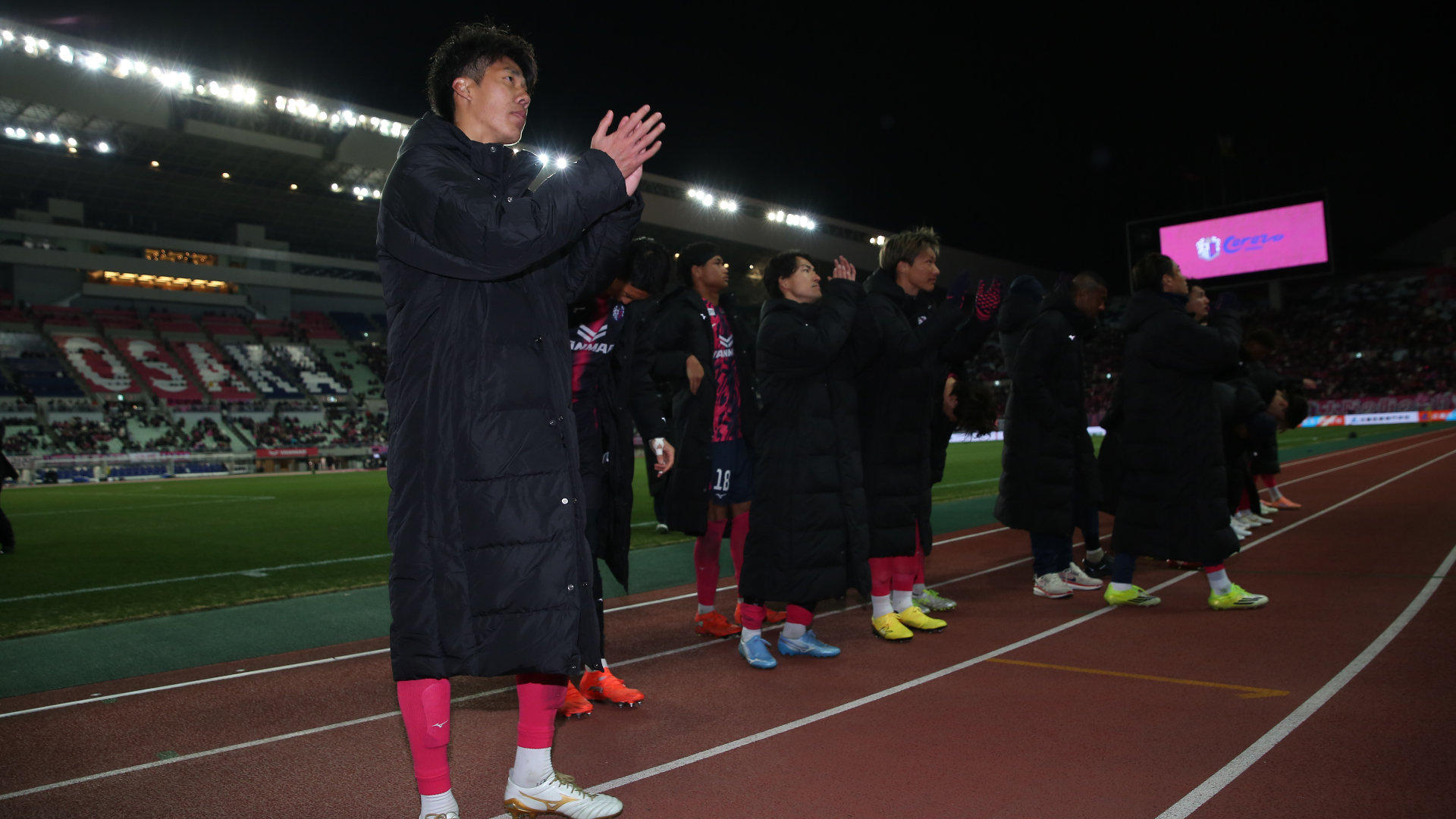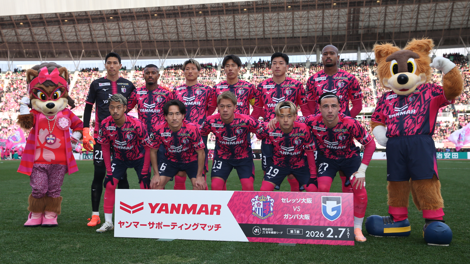 後半開始からパパス監督は本間至恩とチアゴに代えて阪田澪哉と石渡ネルソンを投入。布陣はそのまま[5-3-1]で、阪田を右のウイングバック、石渡を中盤3枚の中央に置いた。後半もボールはガンバに握られたが、サイドから入ってくるクロスはしっかりと中ではじき、ミドルシュートもGKキム ジンヒョンがセーブ。「セットプレーの守備もそうですが、今年は高さが加わっているので、クロスを受けてもしっかり弾けることは今年の良さ」とは田中駿。キャンプから自らを追い込み、開幕スタメンを掴んだジンヒョンも、「昨年は失点が多かった。今年は最初から失点ゼロで抑えたいという思いでプレーしました」と振り返る。63分には喜田に代わり吉野恭平が入り、吉野が3センターバックの左に、田中駿が再び1列上がって中盤の真ん中に入り、石渡が中盤3枚の左に移った。71分には1トップもテコ入れ。期待の新戦力、イェンギ クシニがJ公式戦デビューを果たす。すると78分、敵陣でのスローインをイェンギが収め、田中駿を経由して阪田がシュート。10人でもゴールを目指す姿勢を見せる。84分には、ガンバの岸本武流がこの試合2枚目の警告で退場に。数的同数になった試合はここから互いにゴールに迫るシーンを作ったが、得点は生まれず。セレッソも体を投げ出したシュートブロックなど最後まで隙を見せることはなかった。「誰一人集中を切らすことなく守り切れたことは良かった。11人の時も同じクオリティーで(守備を)やれたらもっといいチームになる。得るものが多かったと思います」と中島。この試合では割り切って後ろに人数を固めたこともあるが、今後も自陣ゴール前での粘り強さは継続していきたい。.jpg?w=1920&h=1079)