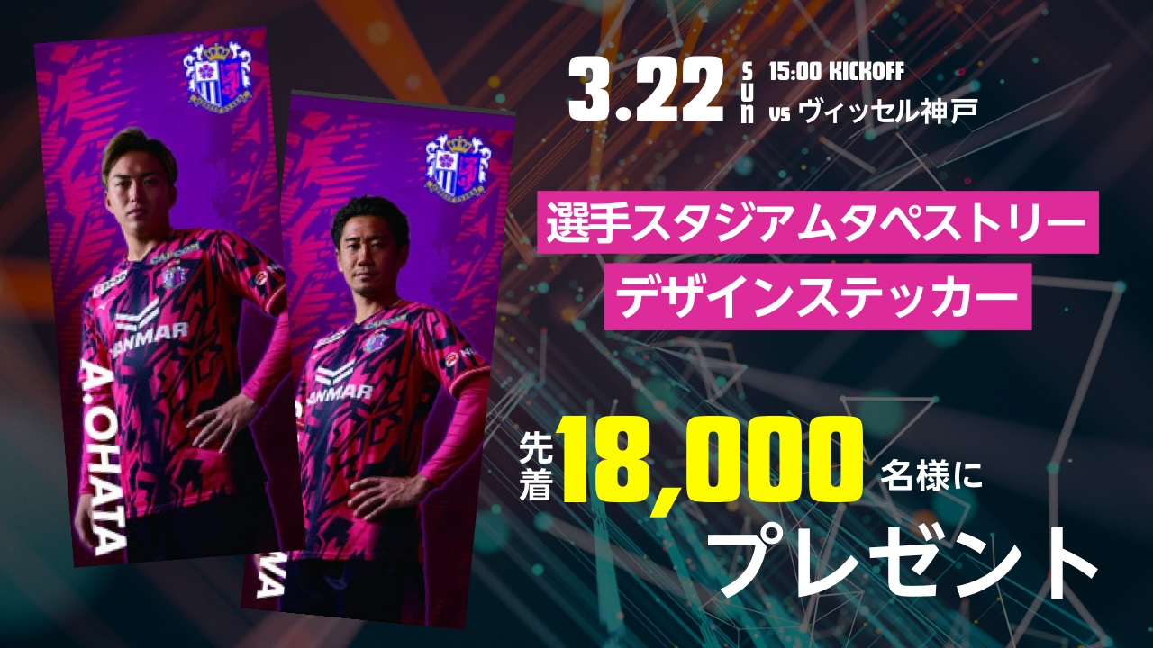 3/22(日)神戸戦で先着18,000名様に「選手スタジアムタペストリーデザインステッカー」をプレゼントいたします。ぜひご来場して手に入れてください!