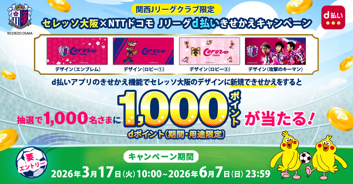 本キャンペーンは、キャンペーン期間中にエントリーのうえ、d払いアプリの支払いバーコードエリアをセレッソ大阪デザインに“新規”できせかえをするとご参加いただけるキャンペーンです。対象条件を満たした方の中から、抽選で1,000名さまにdポイント1,000pt(期間・用途限定) を贈呈いたします。また、ドコモ回線をご利用の方はもちろん、ドコモ回線をご利用でない方も、dポイントクラブ会員であれば無料でご参加可能です。この機会に、d払いアプリをセレッソ大阪デザインにきせかえて、ぜひキャンペーンにご参加ください。