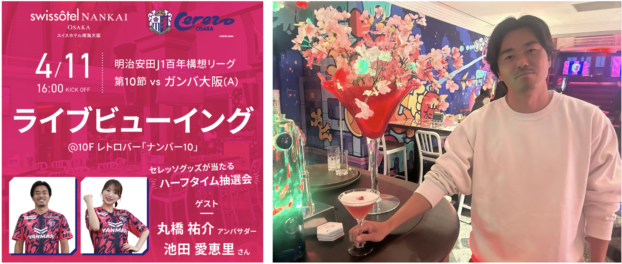 4/11(土)にスイスホテル南海大阪にてアウェイ ガンバ大阪戦のライブビューイングイベントが開催されます。MCは丸橋 祐介アンバサダーと池田 愛恵里さん、セレッソ大阪のグッズが当たるハーフタイム抽選会も実施されるほか、この日限定のオリジナルカクテル「桜カクテル」もご用意されています。ぜひご来場いただき、集まったファン・サポーターのみなさんで選手たちを応援しましょう!