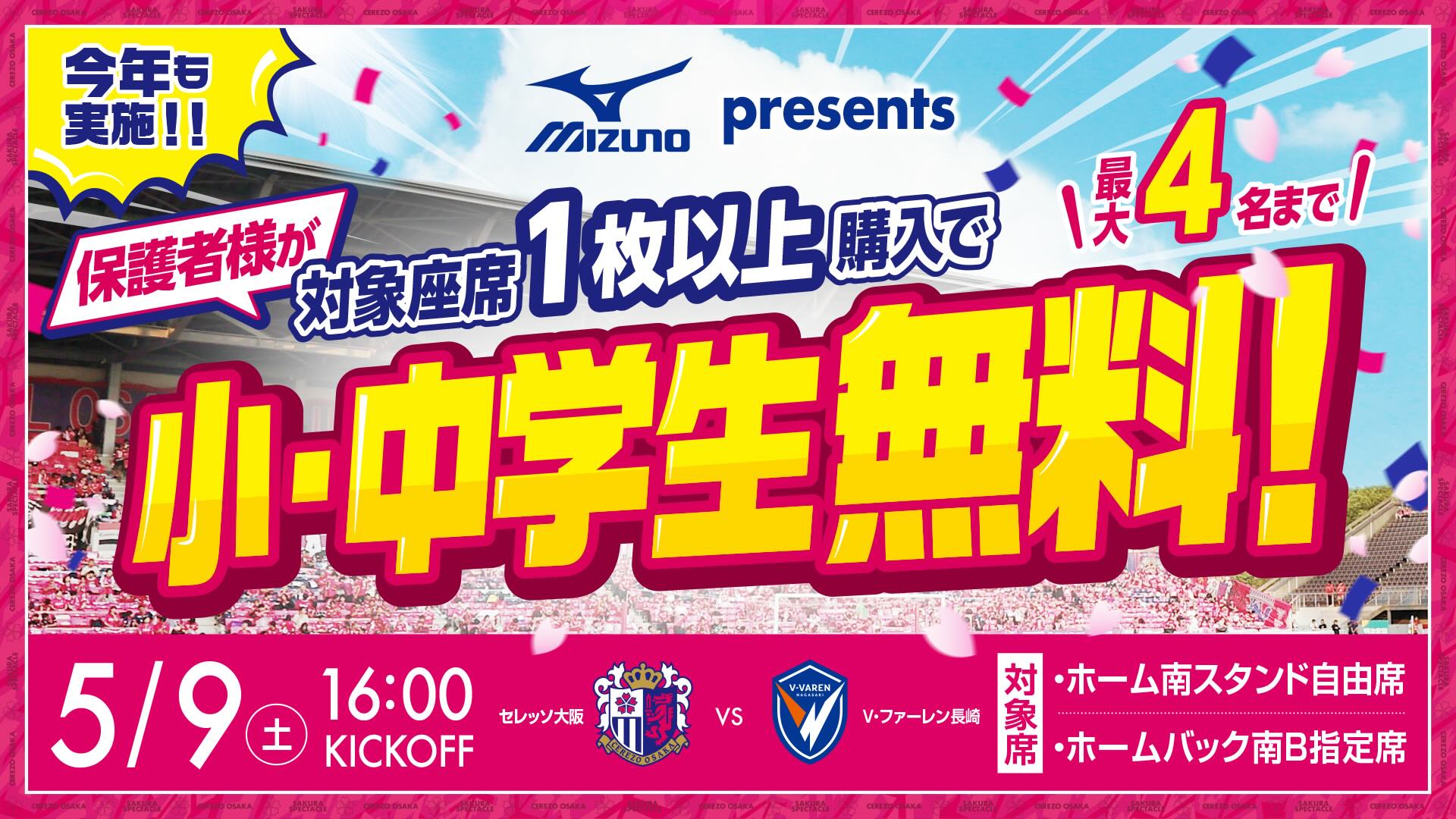 5/9(土)長崎戦にて、トップパートナー ミズノ株式会社のご協力のもと、小・中学生を対象にした無料観戦チケットキャンペーンを実施いたします。本試合はセレッソわくわくキッズデーとして開催が決定しており、本キャンペーンもその一環として実施いたします。なお、本企画は保護者との観戦を前提としており、お子様のみでの観戦やチケットの購入はできませんので、予めご了承ください。