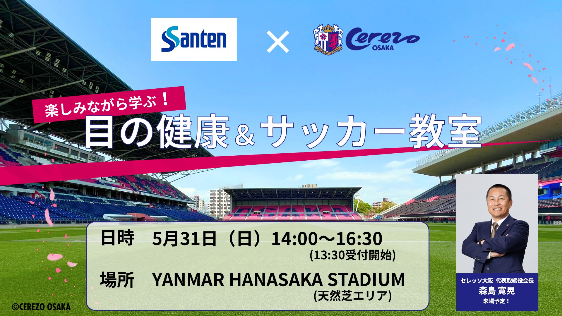 5/31(日)にYANMAR HANASAKA STADIUMにて、参天製薬株式会社と「Santen × セレッソ大阪 楽しみながら学ぶ!目の健康&サッカー教室」を開催いたします。本イベントは、「サッカー教室」と「目の健康教室」の2部構成で、Santenによる、子どもたちの近視をはじめとする「目の健康」をテーマとしたプログラムと、セレッソ大阪サッカースクールコーチによるサッカー教室を行います。ぜひご応募ください!