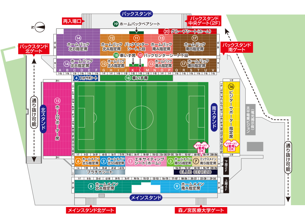 ※メインスタンド上層の4階席やバックスタンド側の座席(手すりなどの妨げ)、前列の座席は(カメラ、看板、ピッチ、ウォーミングアップの選手と距離が近いなど)観戦しづらい場合がございます